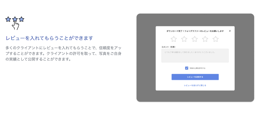 ファイルを共有したお客様がレビューを入れることができます。また、写真の公開許可をとることができるため、レビューと共に自身のポートフォリオとして公開することが可能です。