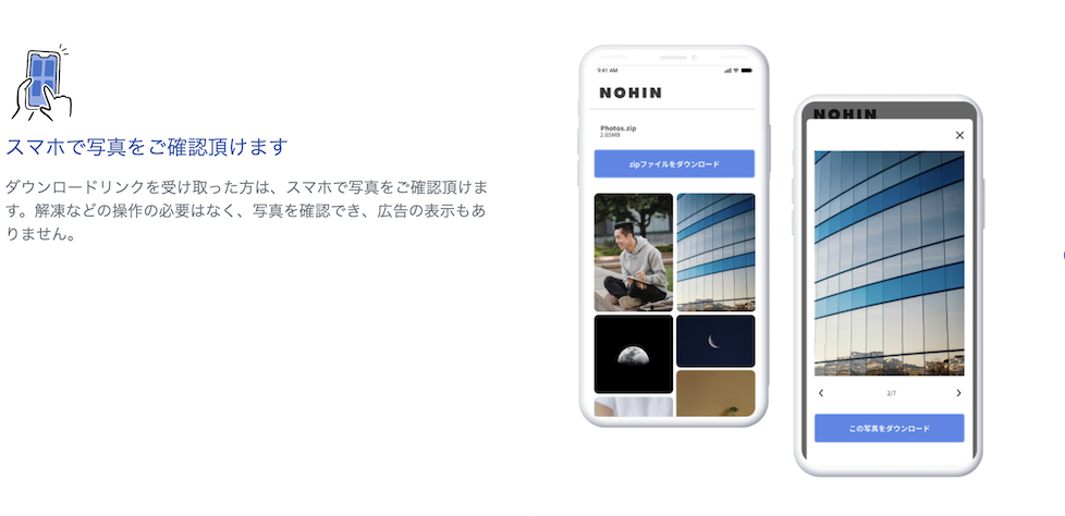 zipファイルで送ったファイルがサムネイルで展開されるため、お客様はスマホでも写真を確認することができます。写真をクリックしてダウンロード、そのままLINEなどで共有することも可能です。