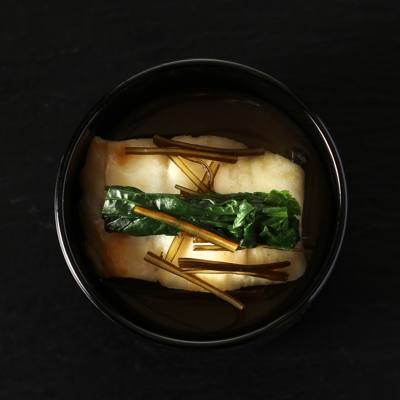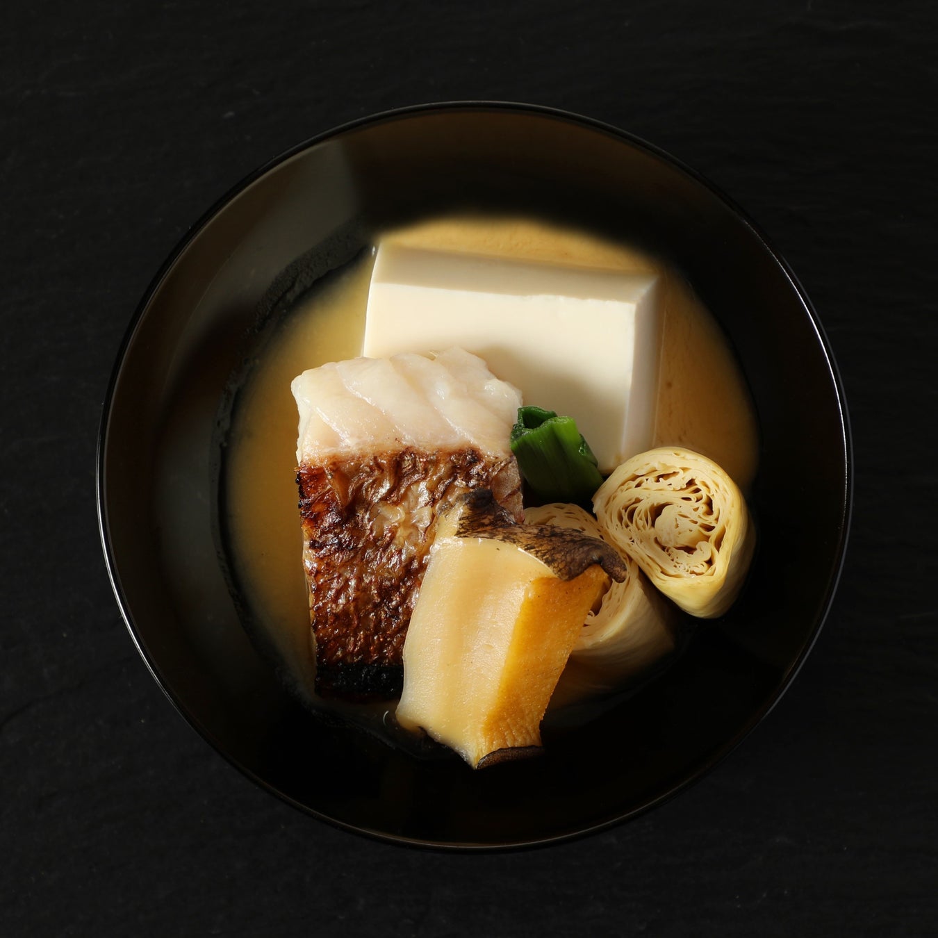 味噌汁の上澄み部分を用いてすまし汁としていました。 今回のご昼食で提供するすまし汁も、同じ方法で調理し、季節に合わせて背切りした鱧と細切した青昆布を合わせ た上品な一品に仕上げています。