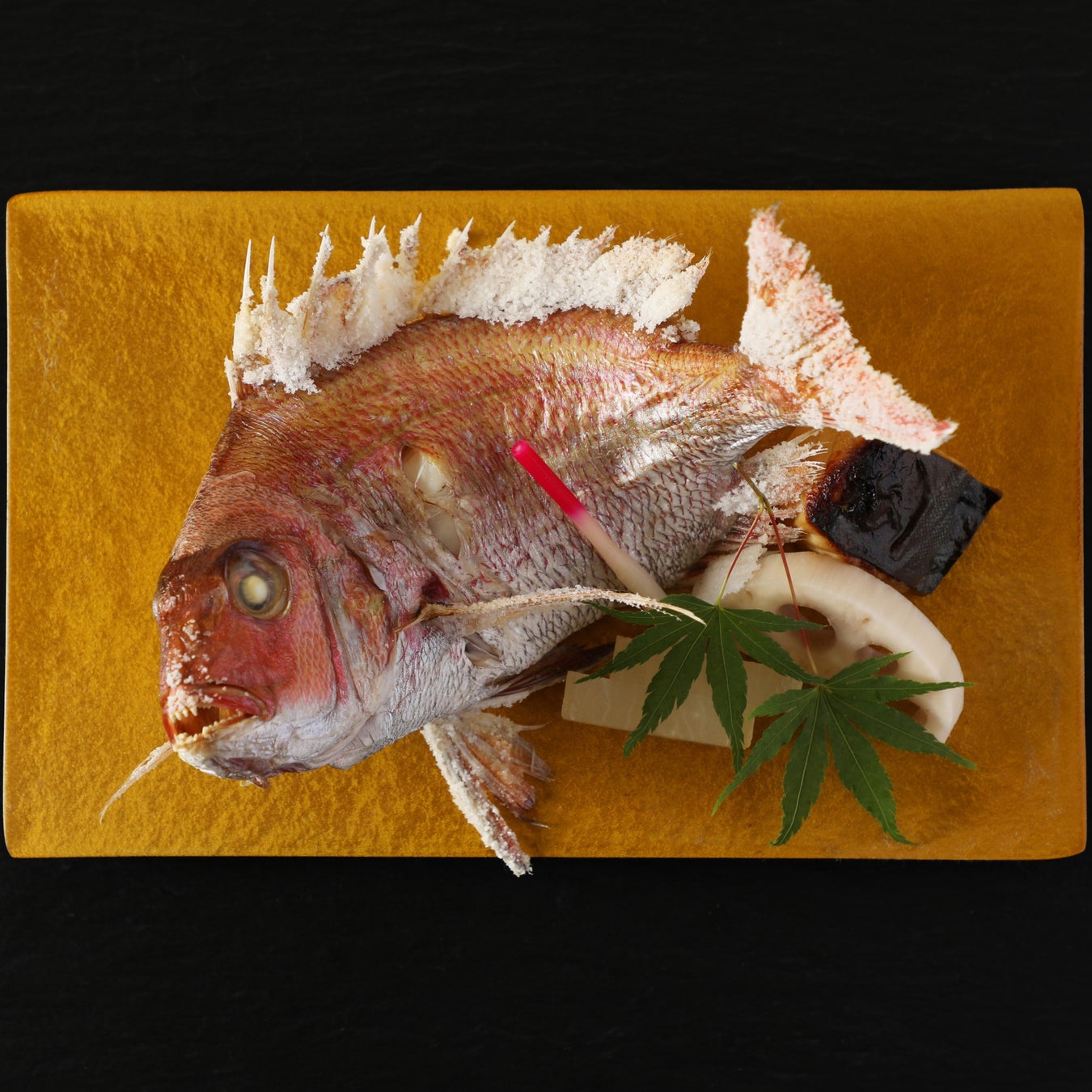 殿様気分を感じていただけるよう尾頭付きで焼き上げた 小鯛は、まさに殿様のご馳走を代表する一皿。味付けは シンプルに塩のみで、素材本来の味をお楽しみください。 出汁と醤油、砂糖で味付けして蒸しあげた鮮魚カステラ、蓮根、つくね芋、照り焼きにした鱸(すずき)を添えております。