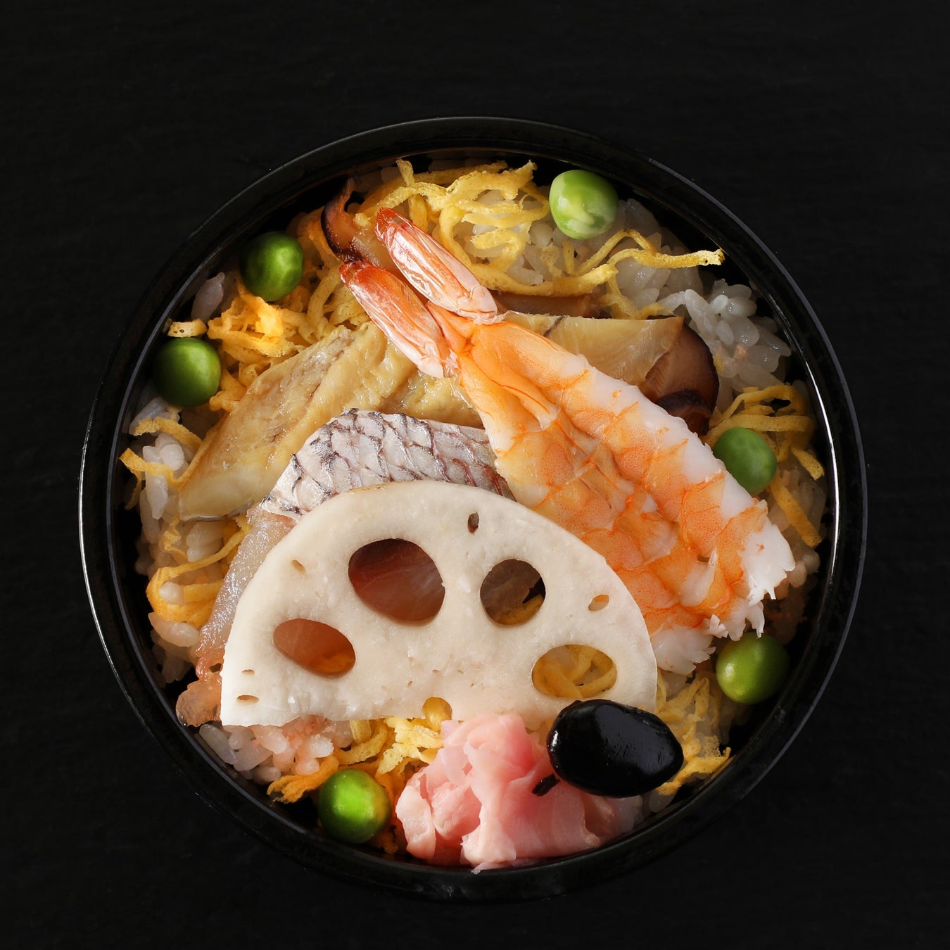 鯛のそぎ身や海老、椎茸、蓮根など具たくさんで華やかな 装いのバラスシ。代表的な具材であるお米や玉子、蓮根は 岡山県産をご用意しました。藩主・慶政好みのバラスシに すべく、酢の味加減や玉子の厚みや巾の広さ、椎茸や生姜 を細めに仕上げるなど、味付けから盛り付けまで当ホテル の和食料理長によって工夫をこらした一品です