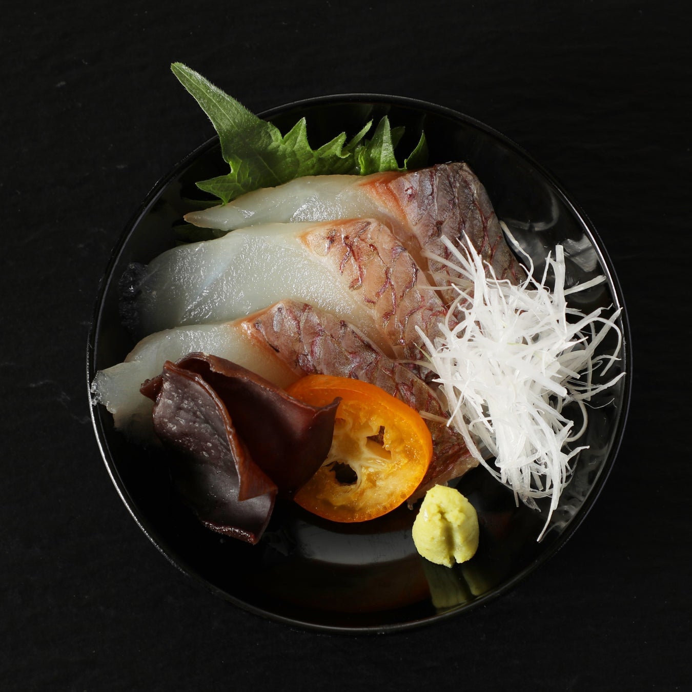 <刺身> 鯛 紋甲イカ 岩茸 白髪うど わさび 金柑 煎酒
