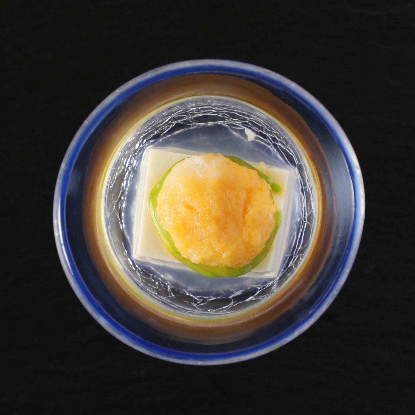 中味噌に酒、みりん、砂糖で味を調え、火を入れた深み ある味わいの味噌を器に敷き、酒煎りした鮑、塩焼きした鯛と長芋、巻湯葉をのせた一品。岡山藩主の池田斉敏 が祖父をもてなした時に出された料理で、玉子を加えて味噌の辛みを押さえ、角の取れた優しい味わいにアレンジしました。