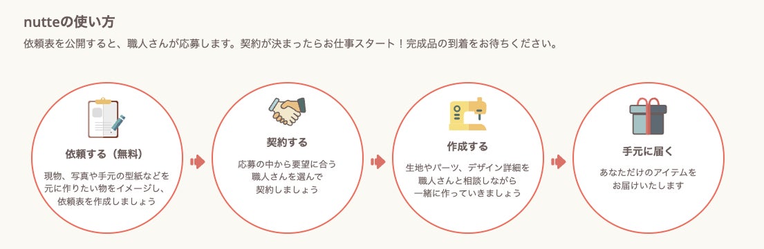 パターンは、シンプルなデザインから上級者向けの本格的な型紙まで幅広く揃っており、nutteに登録するプロの職人にお願いすることで自分好みのアレンジも、オリジナリティの溢れるお洋服も、販売用の商品も自由自在に製作できます!