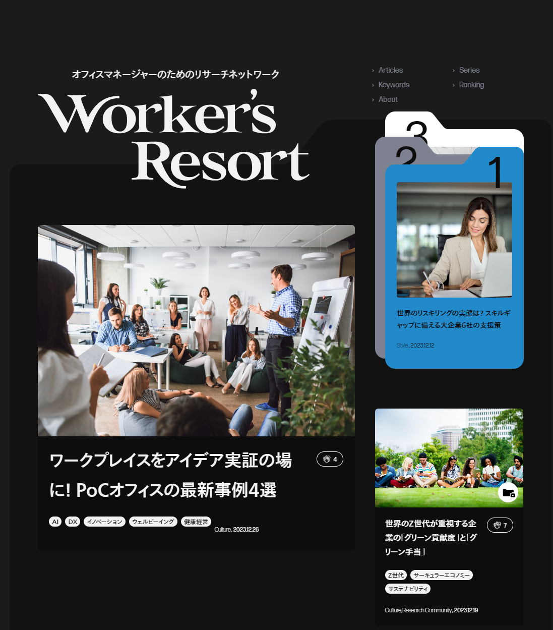 ページ内は、Articles(通常記事)、Series(シリーズ記事)、Keywords(タグ・キーワードのまとめ)、Ranking(週間・月間・会員内の閲覧ランキング)で区分され、欲しい情報をより見つけやすく、最新のトレンドが一目でわかる構成です。それぞれの記事にタグ・キーワードが付与され、関連する記事やテーマについて知見を深められます。また、2023年8月に締結した世界規模のオンラインコンソーシアム「WORKTECH Academy」とのパートナーシップを生かし、同コンソーシアムの最新研究報告をWorker’s Resortにて翻訳・共有します。
