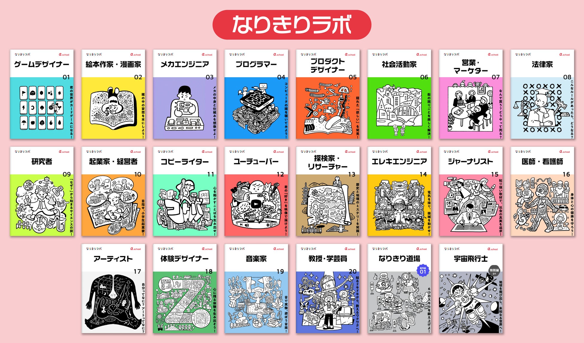 探究学習塾エイスクールの運営に加え、『探究学習100』プラットフォームのもと、小学生向け探究学習プログラム「なりきりラボ®」「おしごと算数®」(グッドデザイン賞受賞)および幼児向け探究学習プログラム「あそびツクール®」を全国展開する(パートナー校約50校/2024年9月現在)。また、2023年4月からは、株式会社ベネッセコーポレーションの運営するチャレンジスクールにて、「オンライン探究学習」コースを提供。