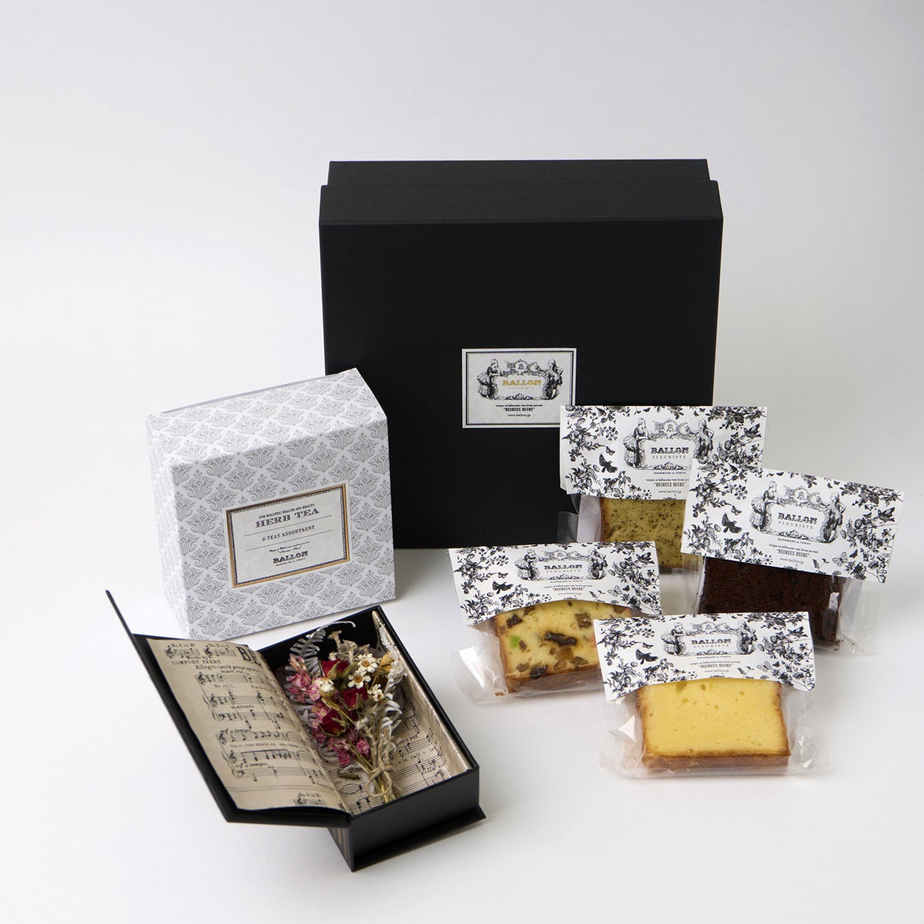 セット内容:ボックスブーケ(ローズ)、ハーブティーセット(6包入り)、カットパウンドケーキ(4種)