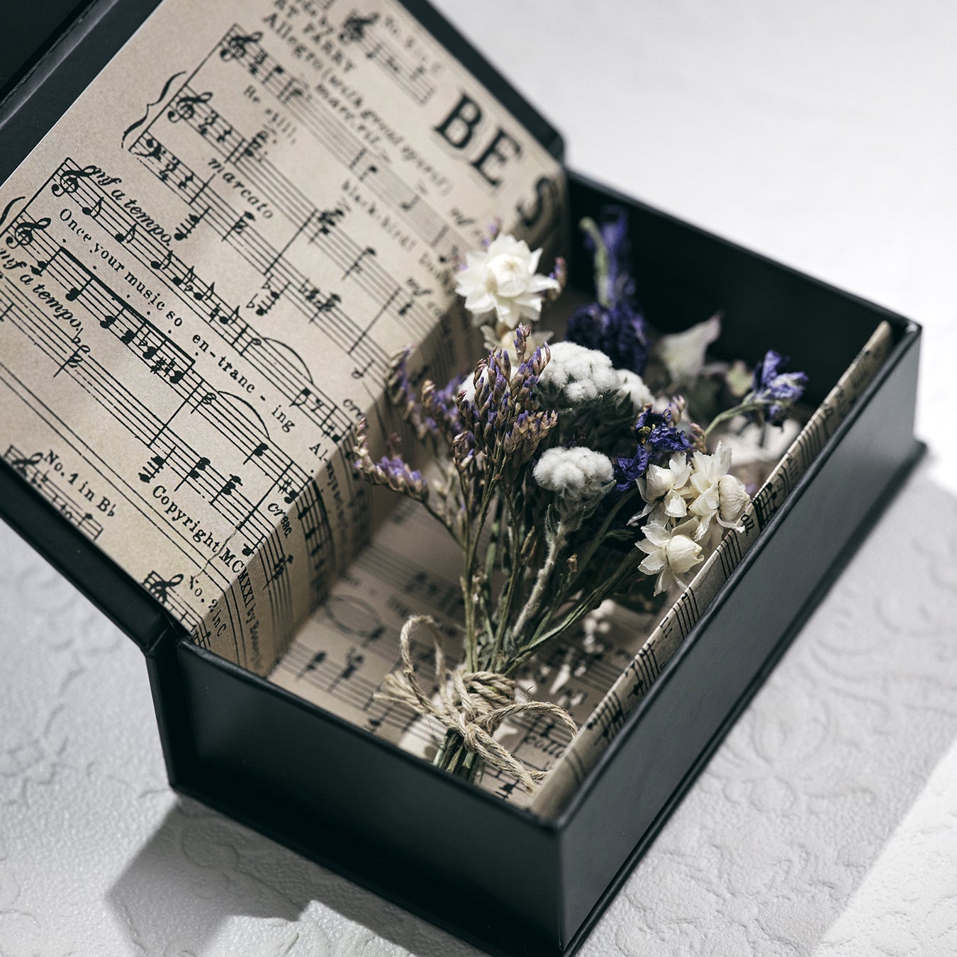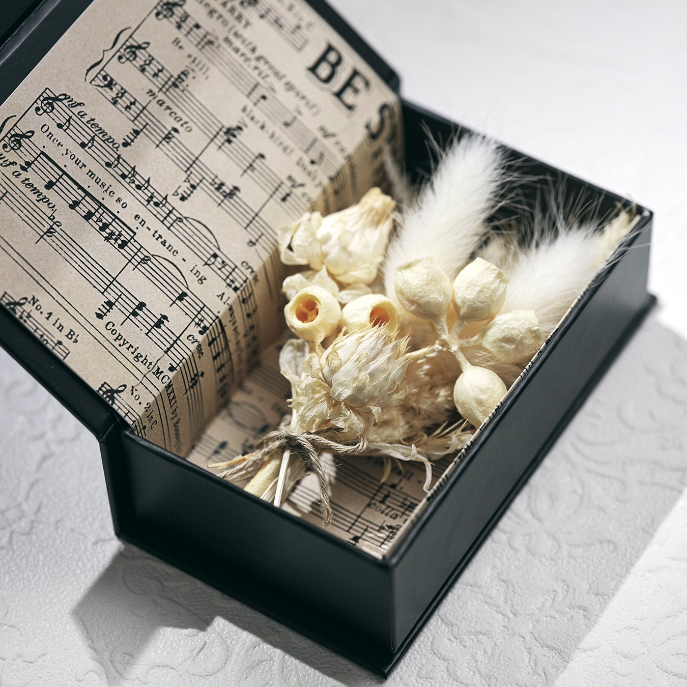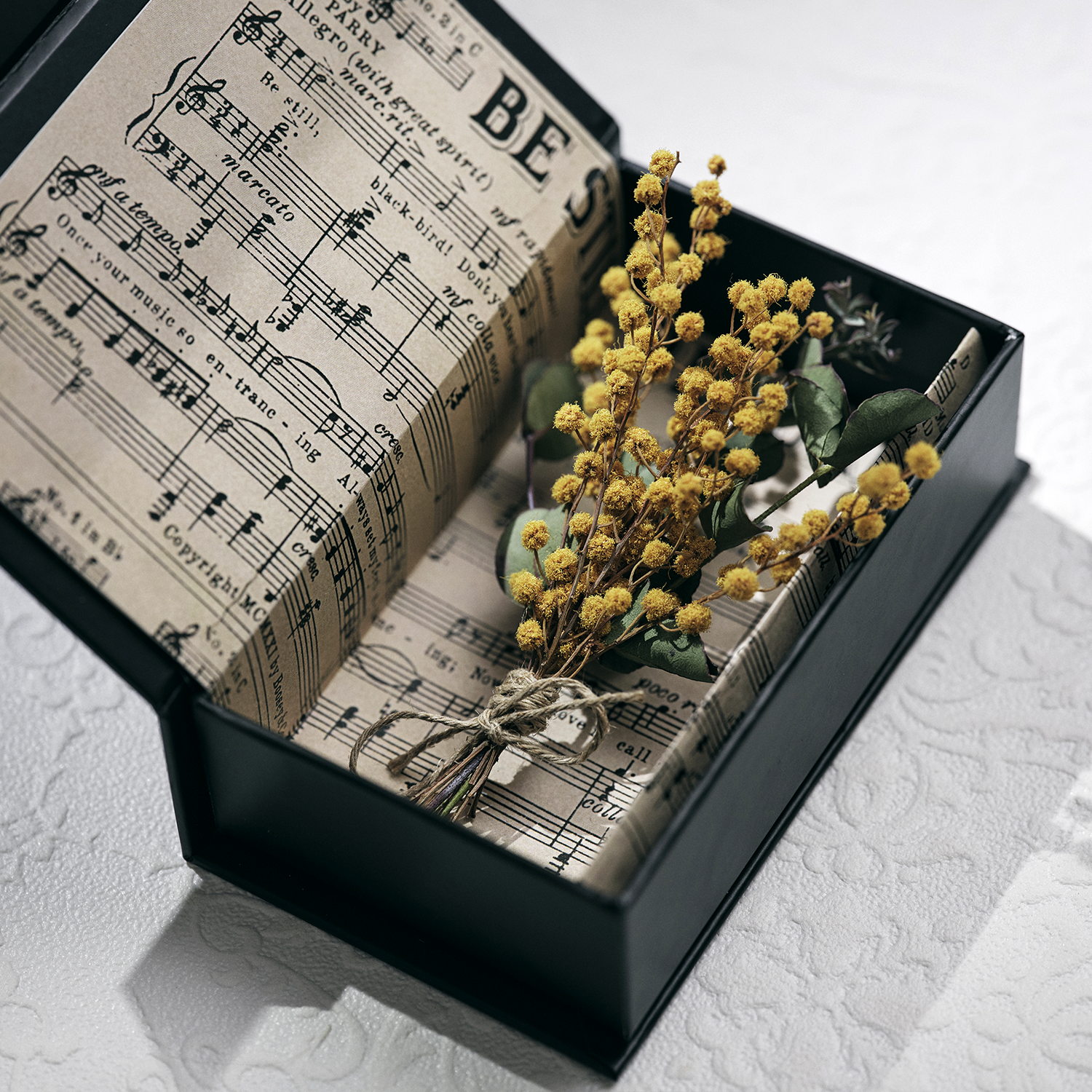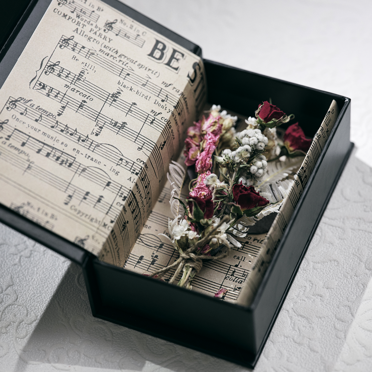 まるでアンティークの本のような、ケースに入ったフラワーブーケ。