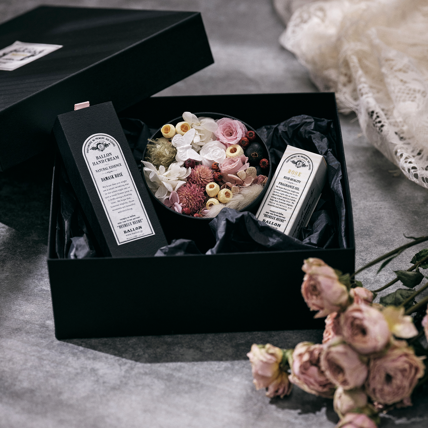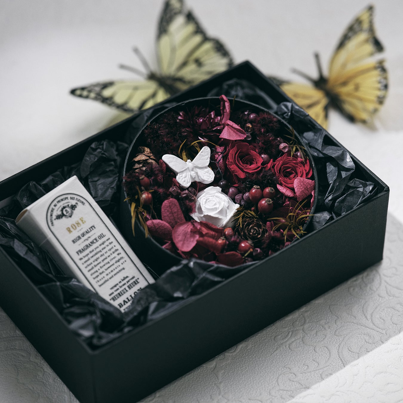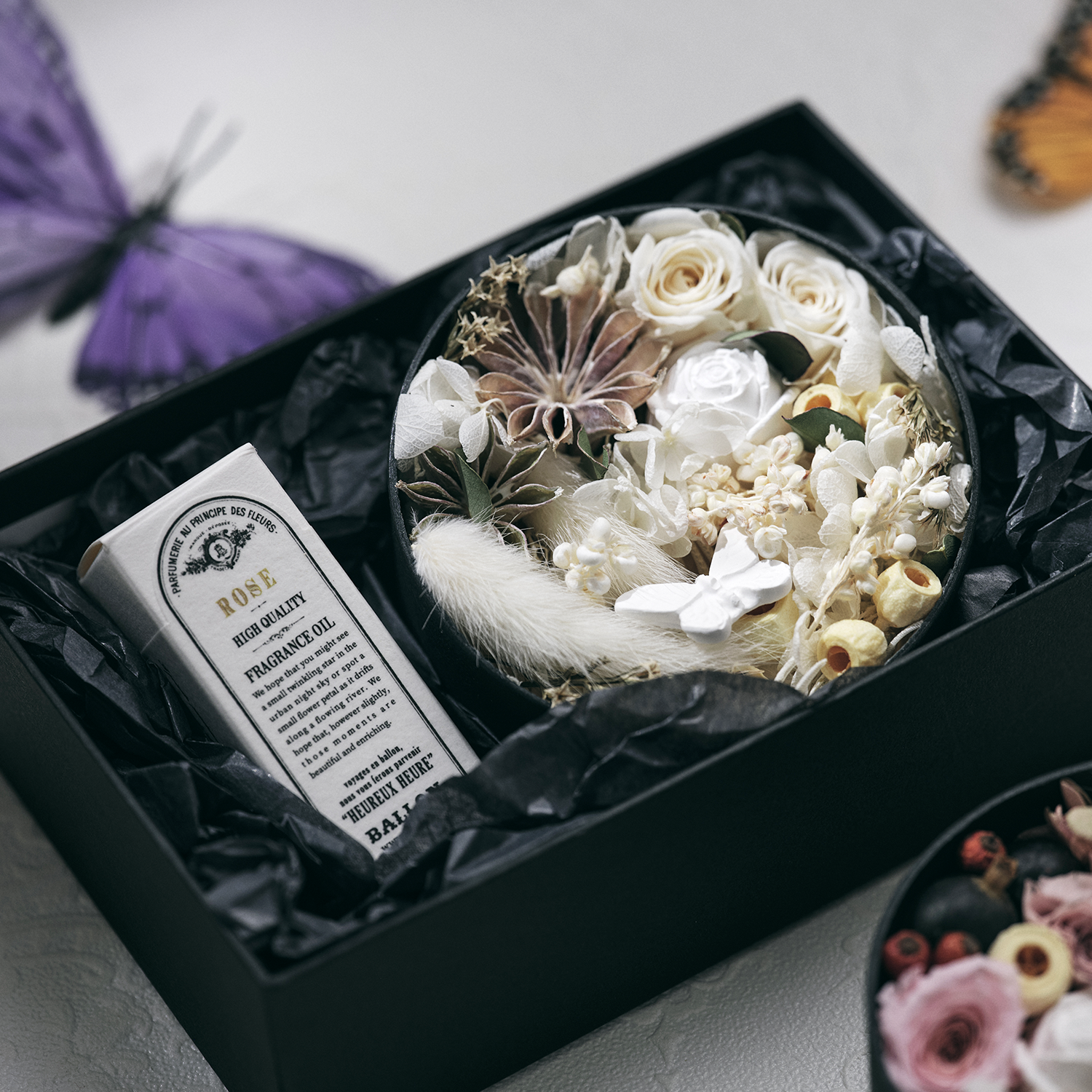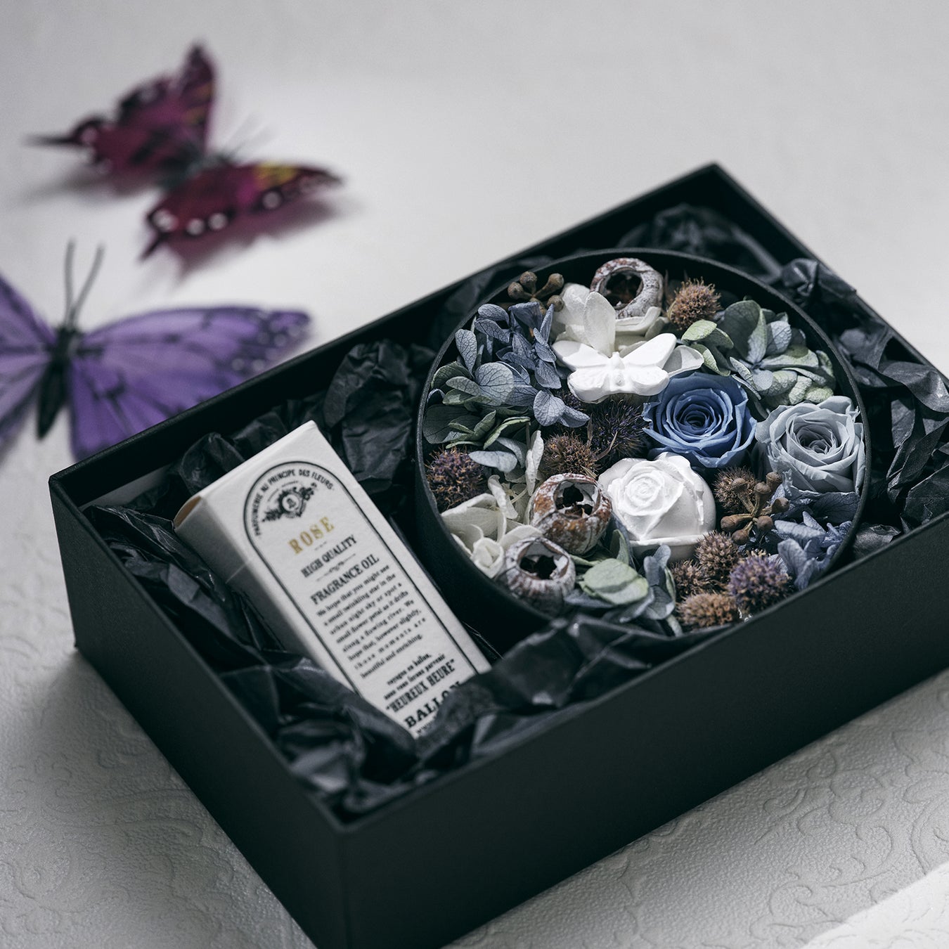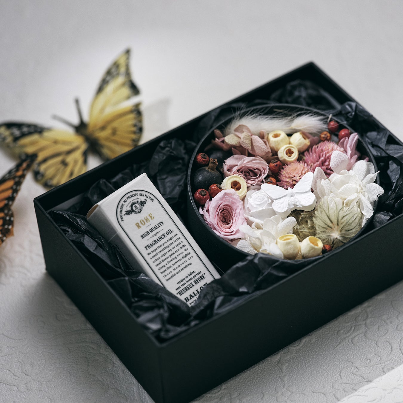 フラワーボックスのアレンジメントとフレグランスオイルのギフトセット。