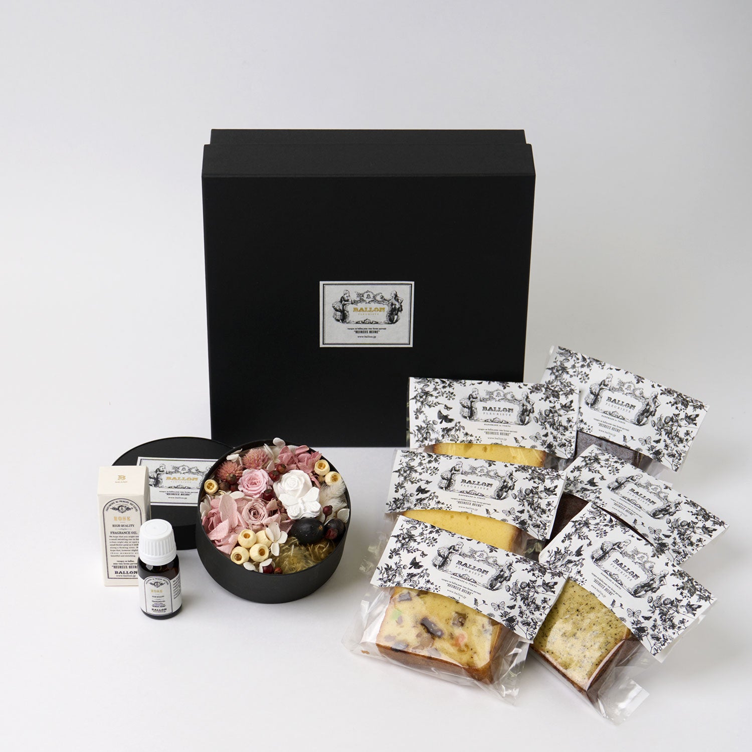 セット内容:アロマフラワーアレンジメント(ピンク)、カットパウンドケーキ(4種6個)