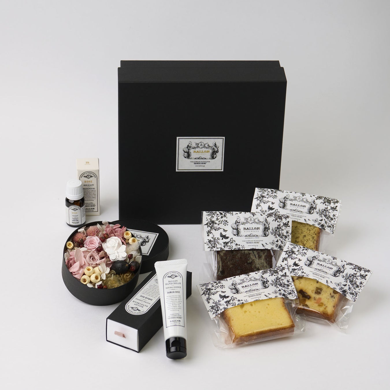 セット内容:アロマフラワーアレンジメント(ピンク)、ハンド用美容液クリーム(ダマスクローズ)、カットパウンドケーキ(4種)