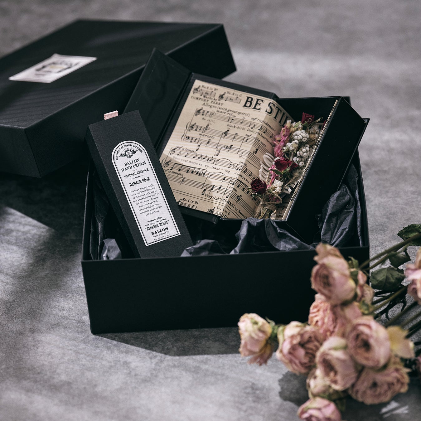 セット内容:ボックスブーケ(ローズ)、ハンド用美容液クリーム(ダマスクローズ)