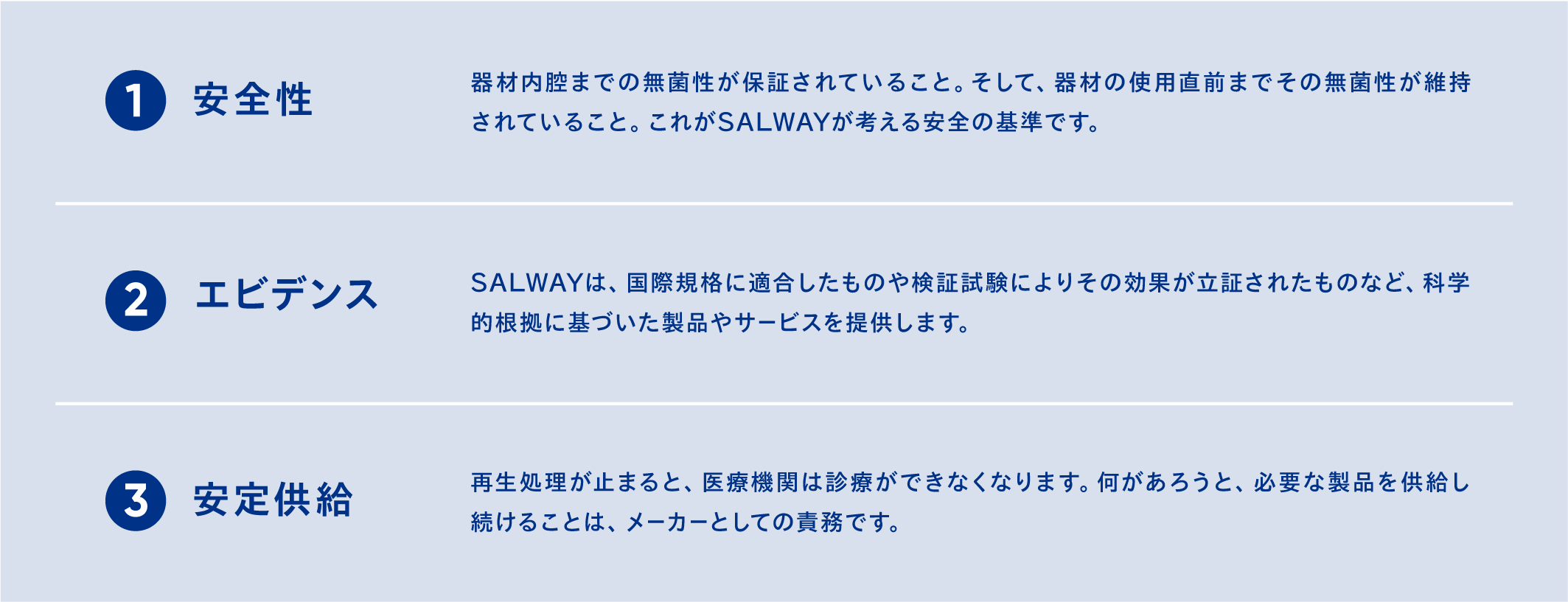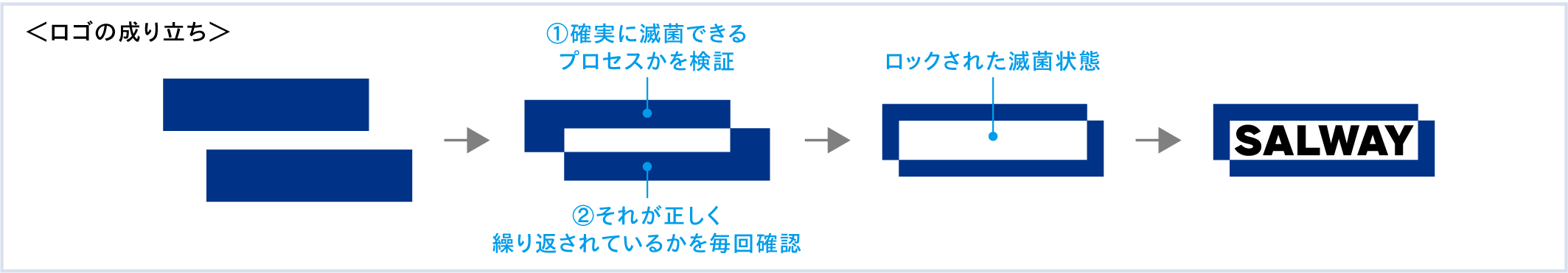 再生処理の達成基準である「無菌性保障水準(Sterility Assurance Level)」を指す(SAL)と目指す道(WAY)をあわせたブランドネーミング「SALWAY(サルウェイ)」としました。SALを達成するための道を示し、現場で真摯に取り組む方々と共に歩むという思いを込めています。