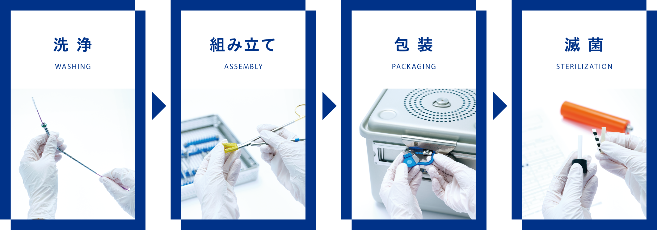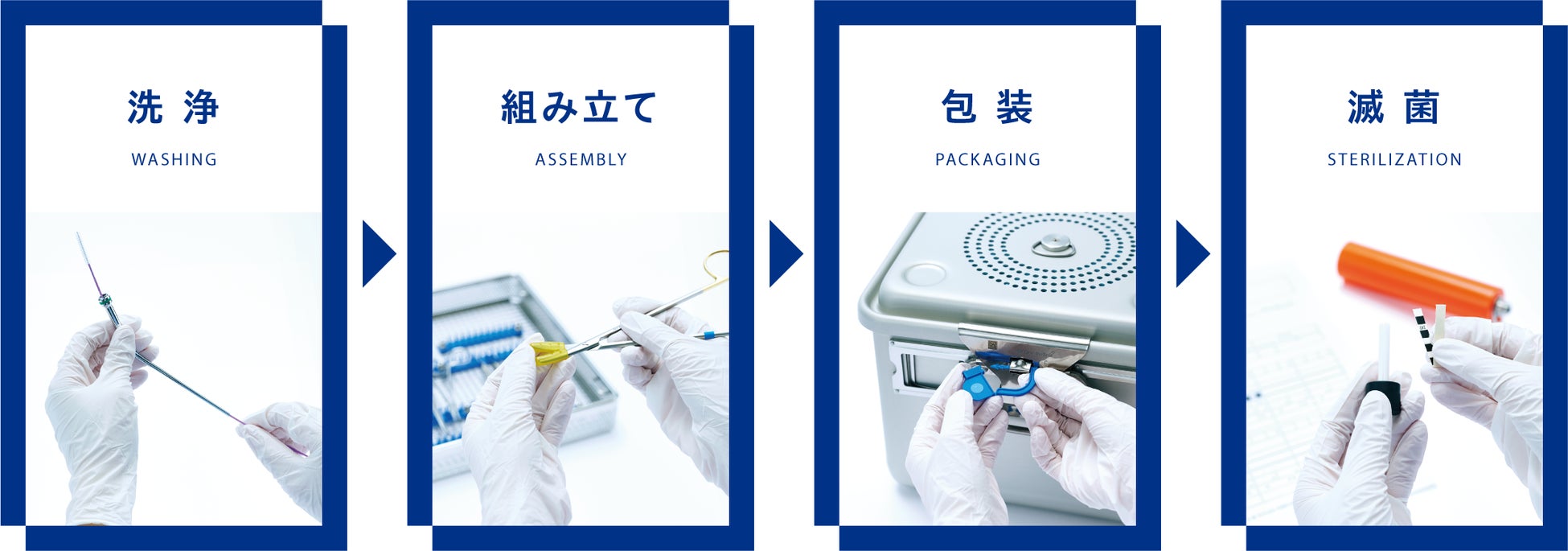再生処理の目的は、「無菌性保障水準(SAL)」を達成した器材をつくりだすこと。洗浄・組み立て・包装・滅菌、すべての再生処理プロセスを適切に行って初めて、SALが達成できます。今回のブランディングでは、再生処理に必要な製品群を、洗浄・組み立て・包装・滅菌の4つのプロセスのもとに整理。SALWAYは、これら全プロセスを網羅する製品群を取り扱うことで、プロセスの重要性を啓蒙しています。