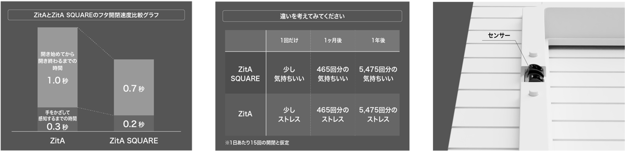 フタ開閉時間を「1秒」から「0.7秒」へ変更したことで、待ち時間を短くしました。さらに、感知速度も「0.3秒」から「0.2秒」へ変更。現行のZitAと比べ、待つストレスなくお使いいただけます。