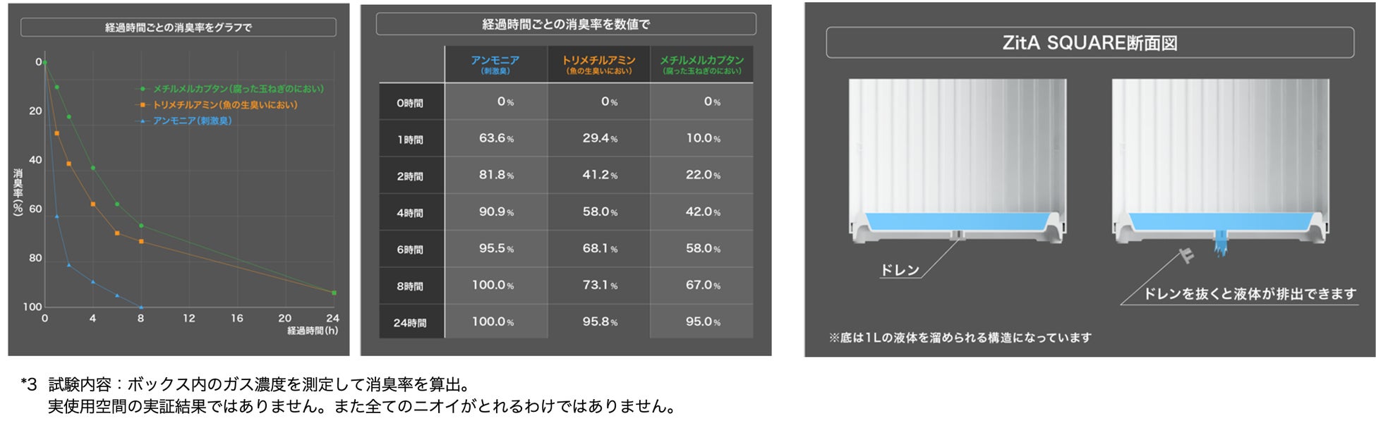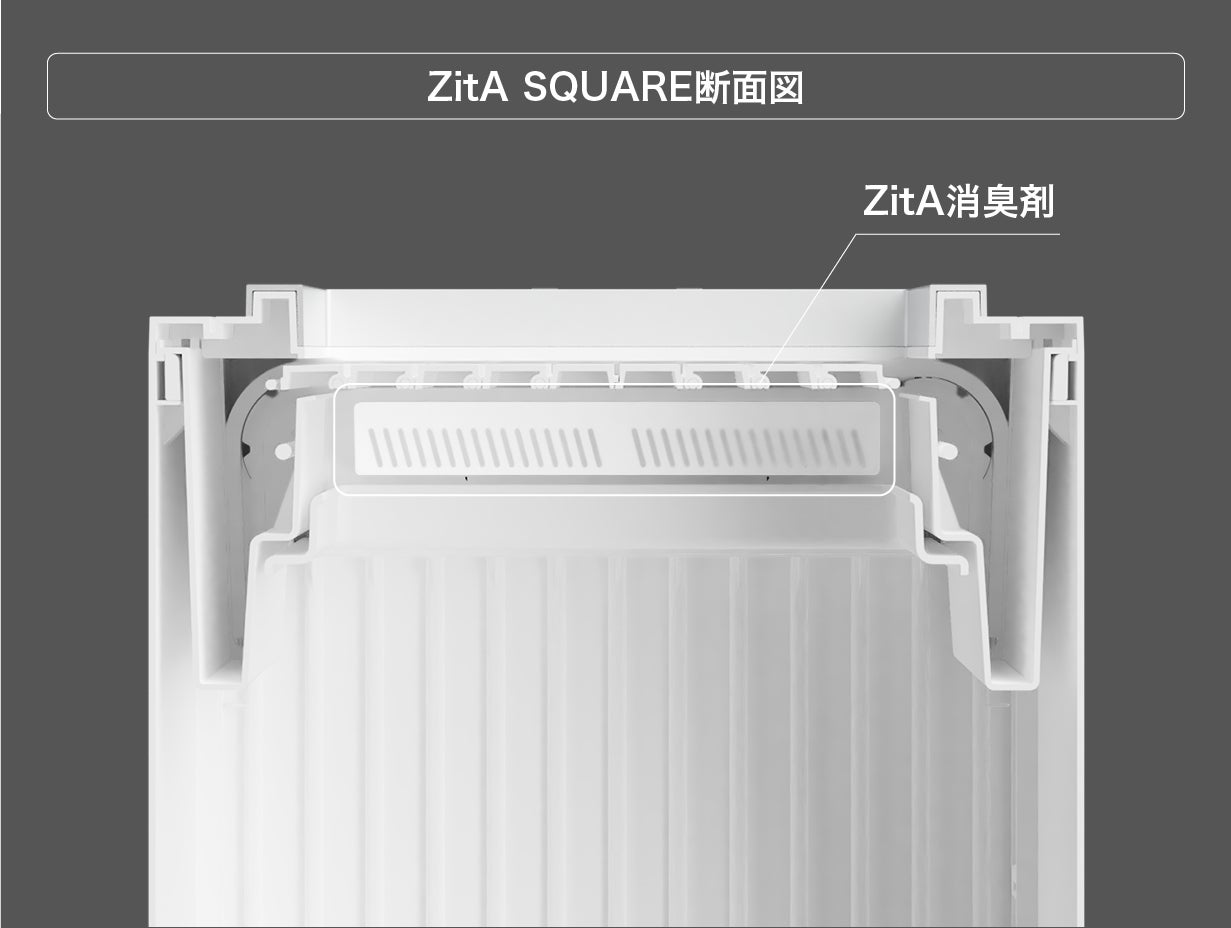 ZitA SQUAREのフタ部分に、消臭剤メーカー協力のもと、消臭剤(無香料)を搭載しました。ZitA消臭剤に付着させた特殊な薬剤がゴミ箱内の悪臭原因物質を吸着・分解します。実機に近い環境で消臭性能を確かめる試験*3を行ったところ、悪臭の種類によって差はあるものの、24時間後には95%以上の消臭を行うことができました。