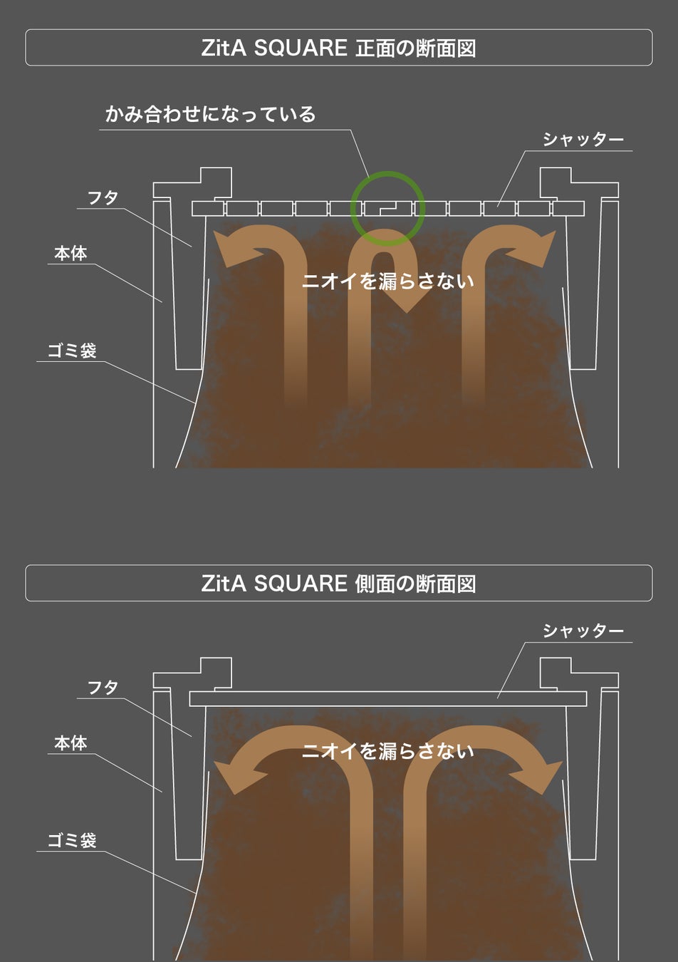 ニオイが漏れそうな箇所全てにかみ合わせ構造を採用したことで、よりニオイが漏れにくいようにしました。