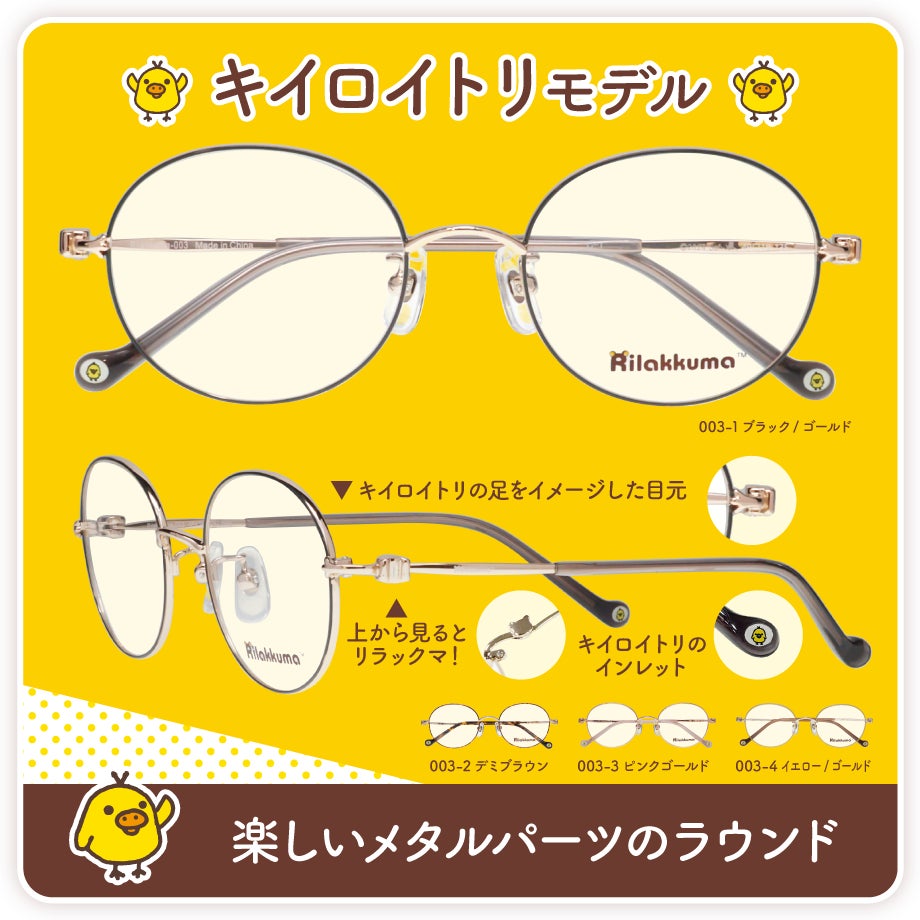 しっかり者で、頼れるキイロイトリをイメージした「キイロイトリモデル」は、楽しいメタルパーツを散りばめたラウンドシェイプのメタルフレーム。目元はキイロイトリの足をイメージ、テンプル接合部は上から見るとリラックマの形になった凝ったデザイン。先セルに入ったキイロイトリのインレットがアクセント!