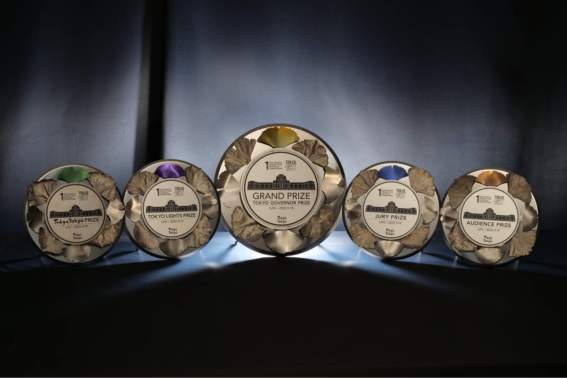 金属板の上に 3 種類のイチョウの葉(特殊メッキ加工をした本物の葉、精密に加工された金属板、彩色されたチタン)を組み合わせたスタイリッシュなデザインで、東京開催にふさわしい、革新の技術が集結した唯一無二のプライズプレートに仕上がりました。