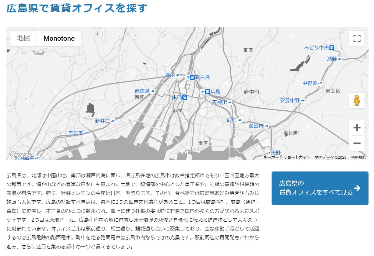 広島エリアは、大手企業だけでなくベンチャー企業も支店・拠点を置くことが多いため、オフィス探しのニーズが高いと判断し、今回新たにサービス対象エリアに含めることになりました。