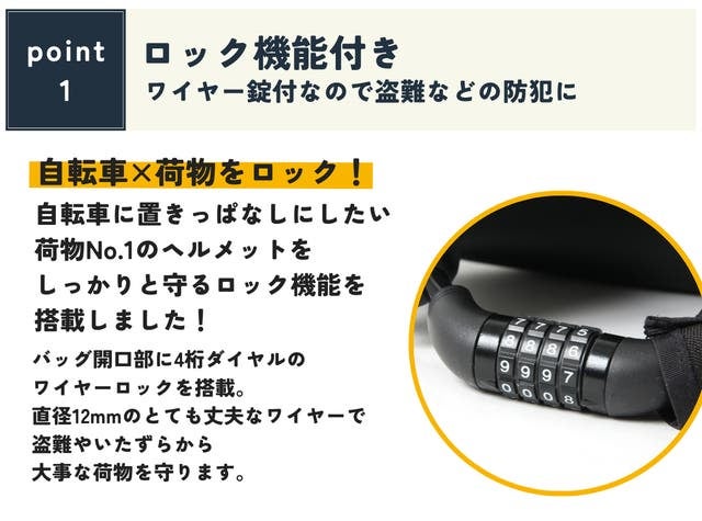 盗難や汚れが心配そんなヘルメットに最適な置き場所を提案。嵐にも耐える耐水性能で大事な自転車ヘルメットを守ります!ダイヤルロック部分とバッグ本体は切り離し可能!ケース内を水洗いできていつでも衛生的!