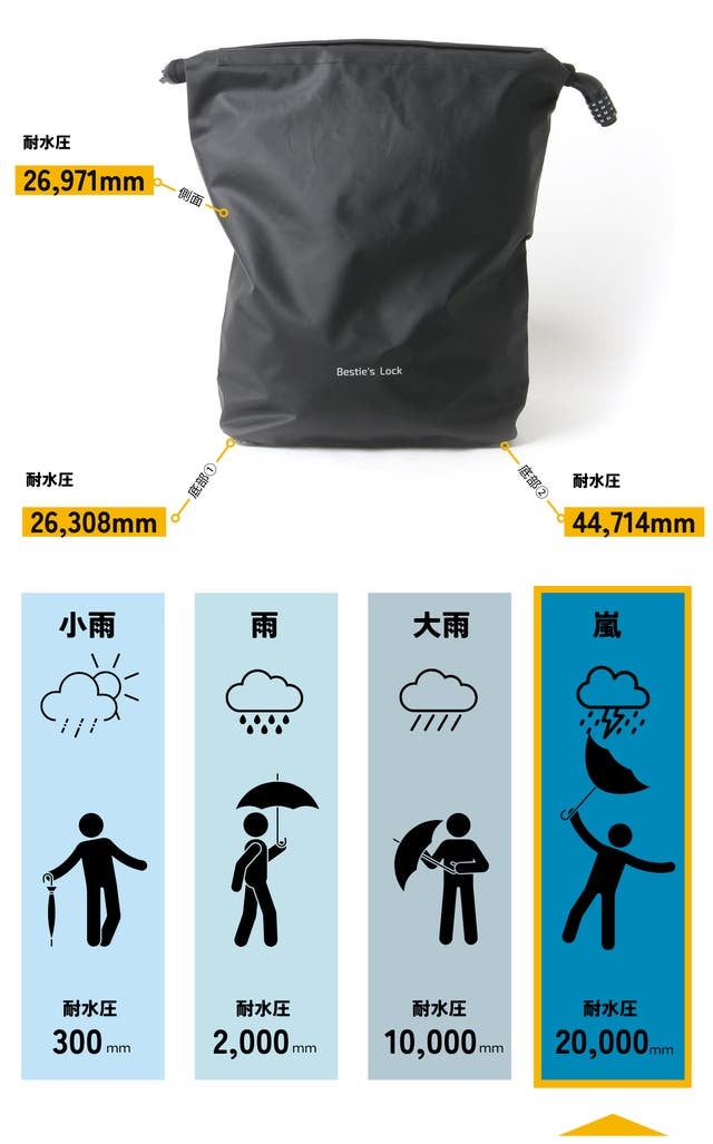耐水圧とは、水の圧力にどれくらい耐えられるかを示す数値で、【mm】で表します。ベスティ―ズロックは、高周波圧着部分の底部・側面での耐水圧試験において、嵐にも耐える数値である20,000mm以上を獲得する結果となりました。