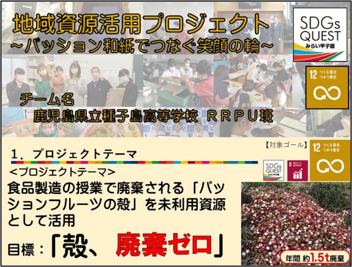 鹿児島県立種子島高等学校 RRPU班によるSDGs目標12を起点とした廃棄のパッションフルーツ殻から和紙を商品化した地域循環事業のSDGsアクションプラン。