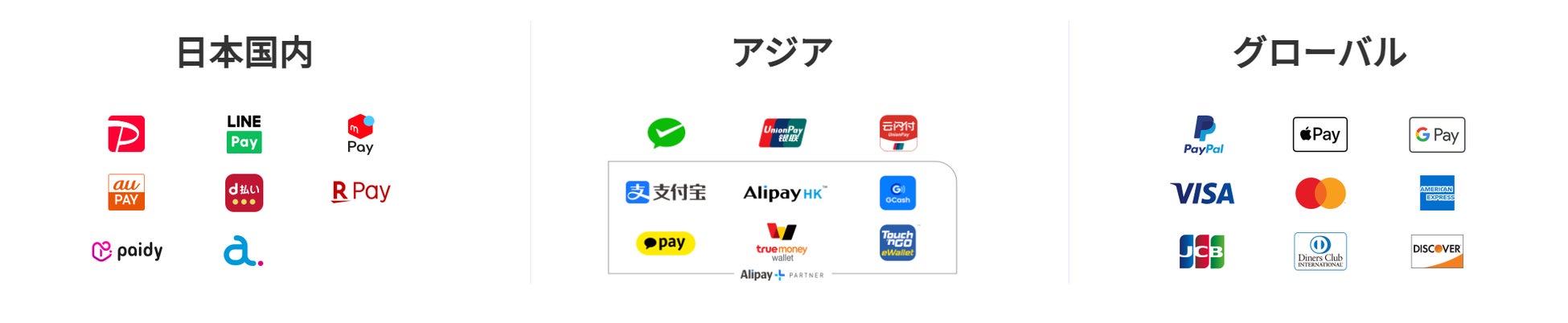 グローバル:PayPal、Apple Pay、Google Pay、VISA, Mastercard、 American Express、JCB、 Diners Club、Discover、AmazonPay