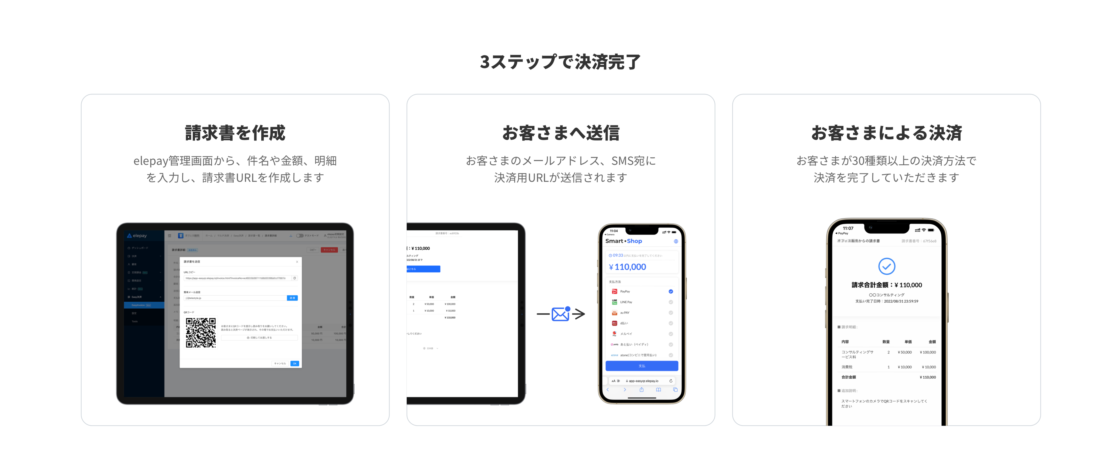 請求書決済が提供するGUI(管理画面)またはAPIから、請求書の原本をわずか数分で作成、QRコードで支払い可能な決済用のWebページを作成してURLを送信したり、支払い用QRコードを印刷した原本をプリントアウトしてお客様へ郵送することができます。