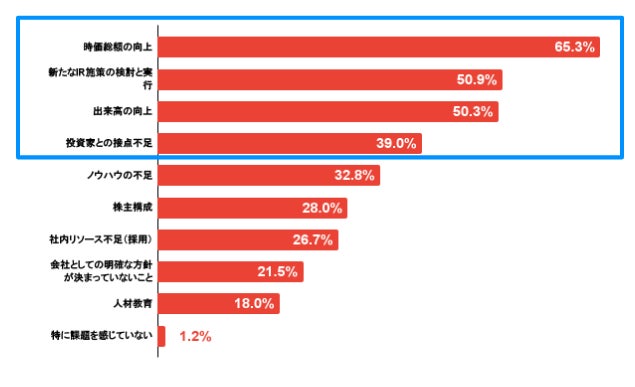 IR活動における課題は、上位から「時価総額の向上」「新たなIR施策の検討と実行」「出来高の向上」「投資家との接点不足」