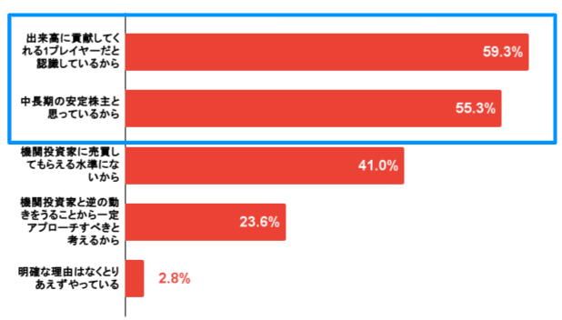 個人投資家向けにIRを実施している企業の理由は、「出来高に貢献してくれる1プレイヤー」「中長期の安定株主と思っている」という結果が上位に