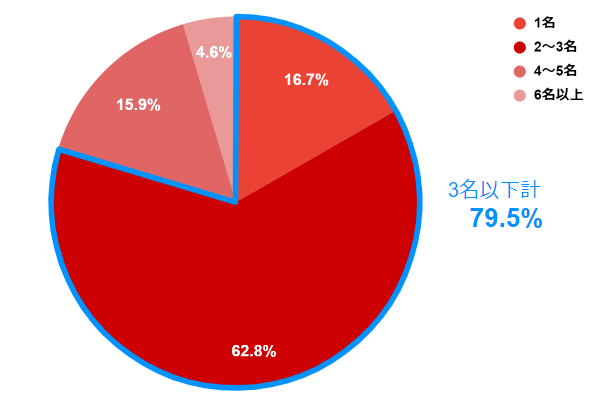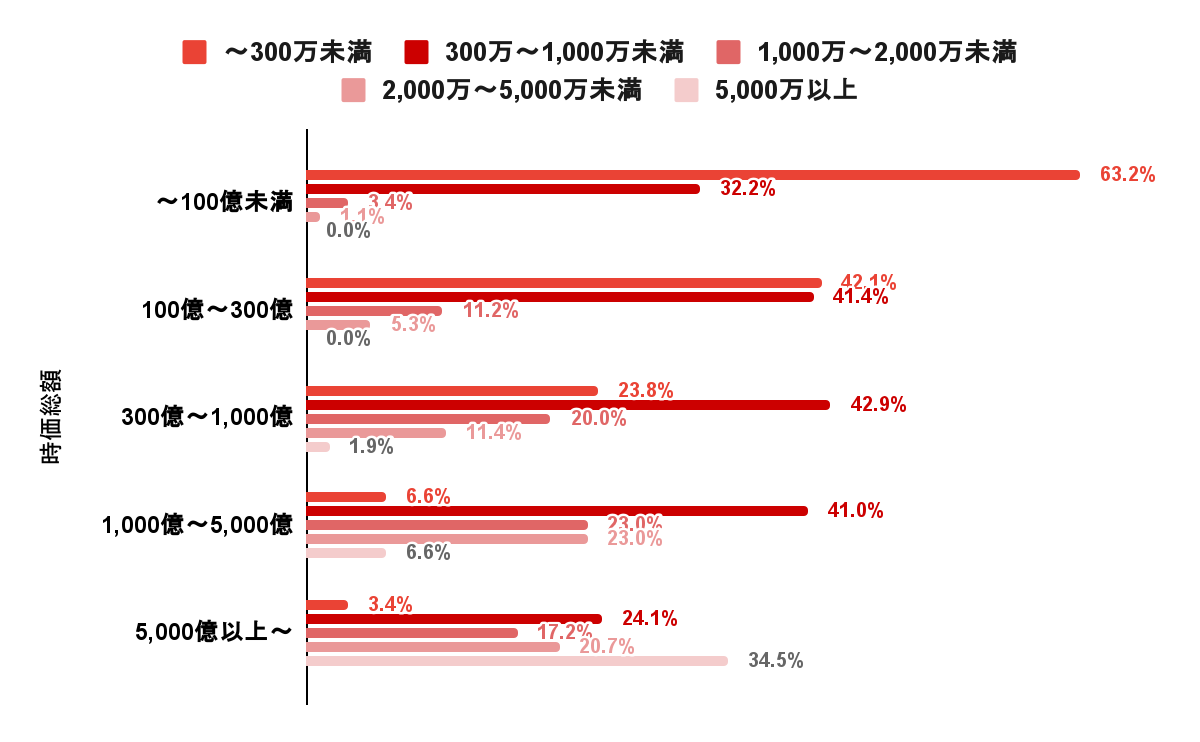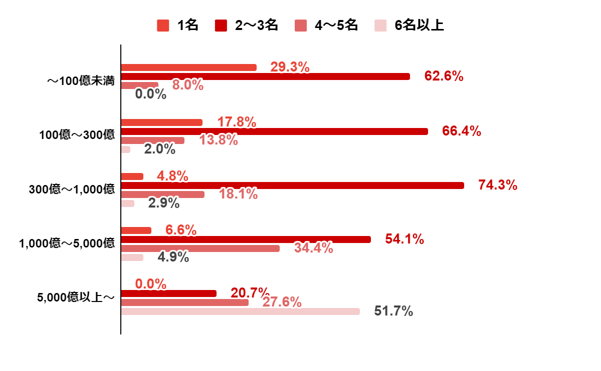 時価総額別で見ると、1,000億円以上の企業が4名以上体制での割合が多い