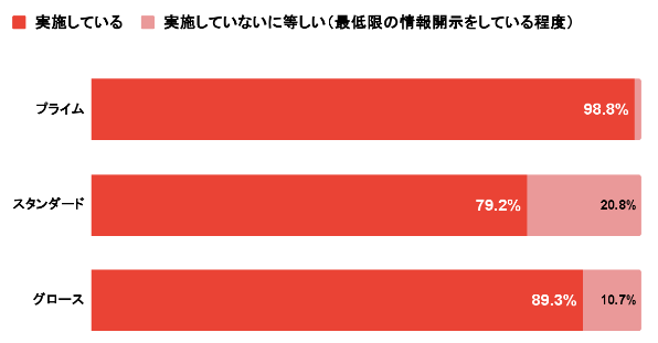 IR活動の実施状況を上場区分ごとに見ると、プライム市場、グロース市場、スタンダード市場の順に実施率が高い結果となりました(図6)。上場区分の基準に流通株式時価総額が含まれることを考慮すると、グロース市場とスタンダード市場の順位が逆転していることは注目に値します。特に グロース市場の企業には高い成長が期待されていることから、成長期にある企業にとって、投資家との関係構築が成長機会の模索のための重要な手段となっている可能性が示唆されます。