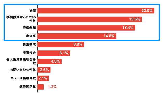目標指標は、上位から「株価」「機関投資家とのMTG件数」「時価総額」「出来高」