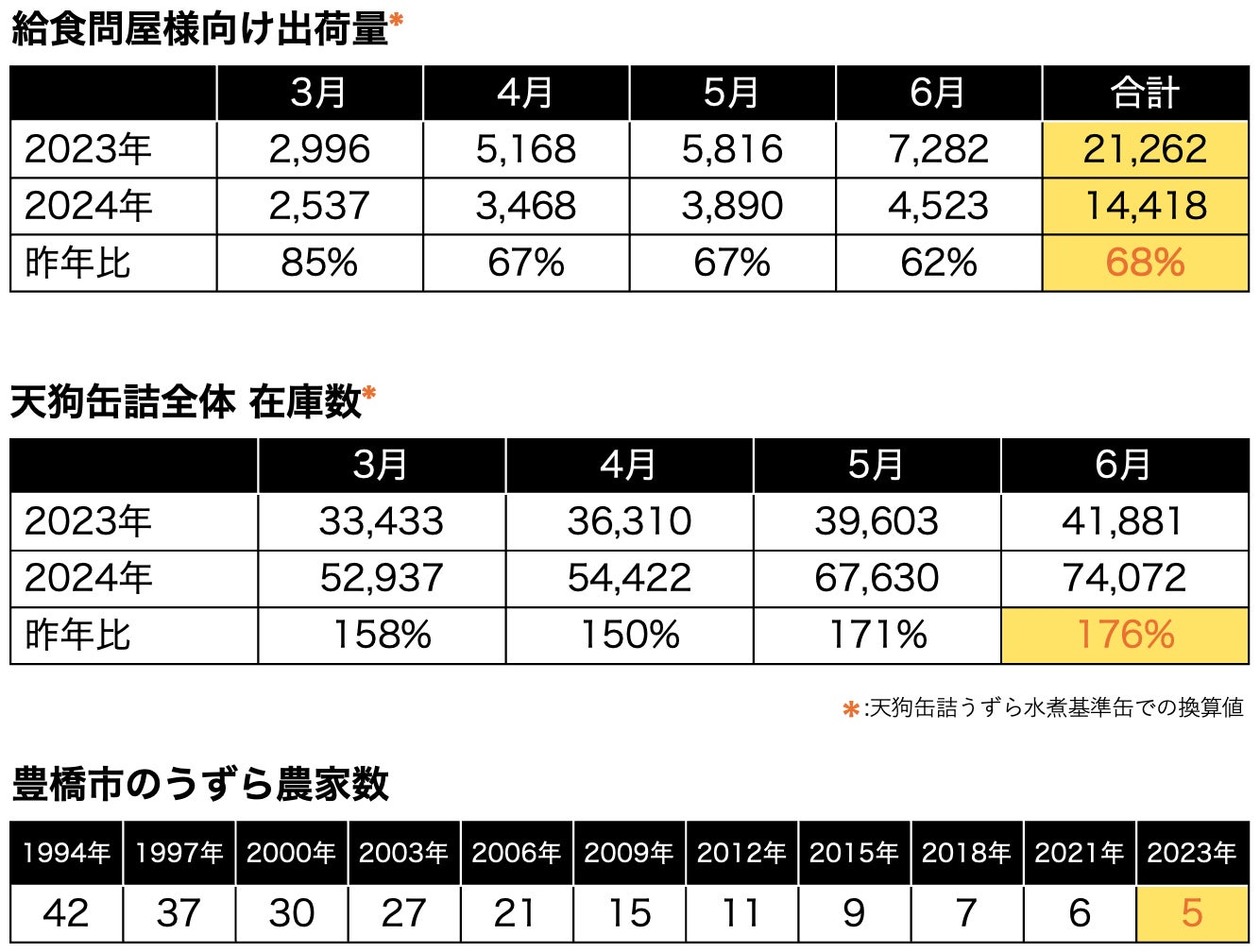 うずら卵は昨年2月の福岡県で発生した学校給食での誤嚥事故以降、販売環境が激変し、主要需要先の全国の学校給食おいて使用中止や使用抑制され、需要が壊滅的な状況にあります。しかしうずら卵生産農家の経営の安定を考え、天狗缶詰は減産策は行わず、製品在庫が増加し続ける厳しい状況にあります。