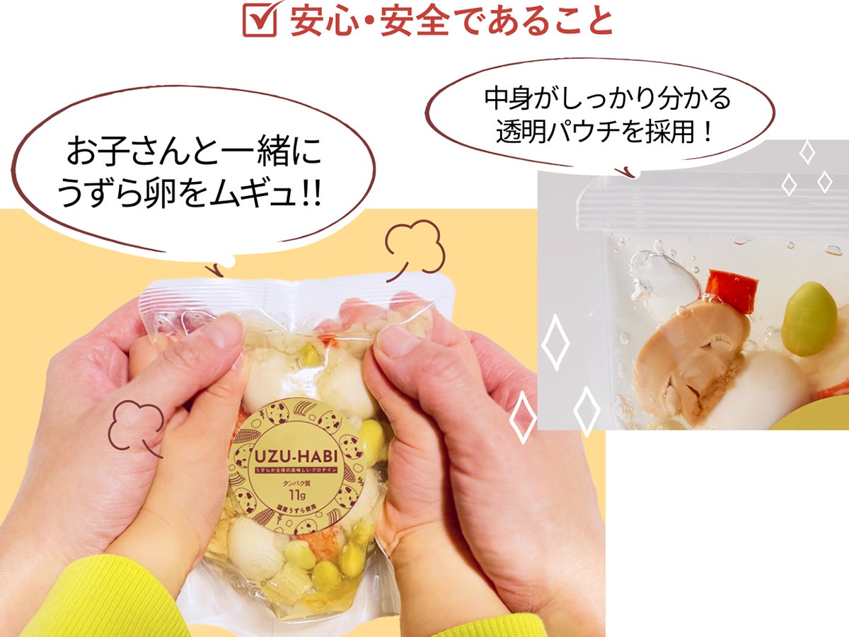 私たちは、食品メーカーとして「安心・安全」は欠かせません。UZU-HABIは、見た目も美味しく食べていただきたい目的もあり、透明パウチを採用しておりますが、もう1つの重要な目的としては、小さなお子様にも安心・安全にうずら卵を食べていただきたいことです。