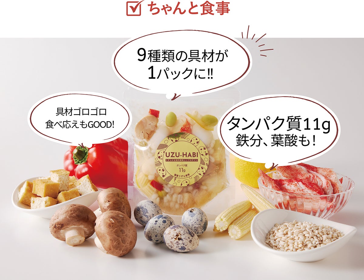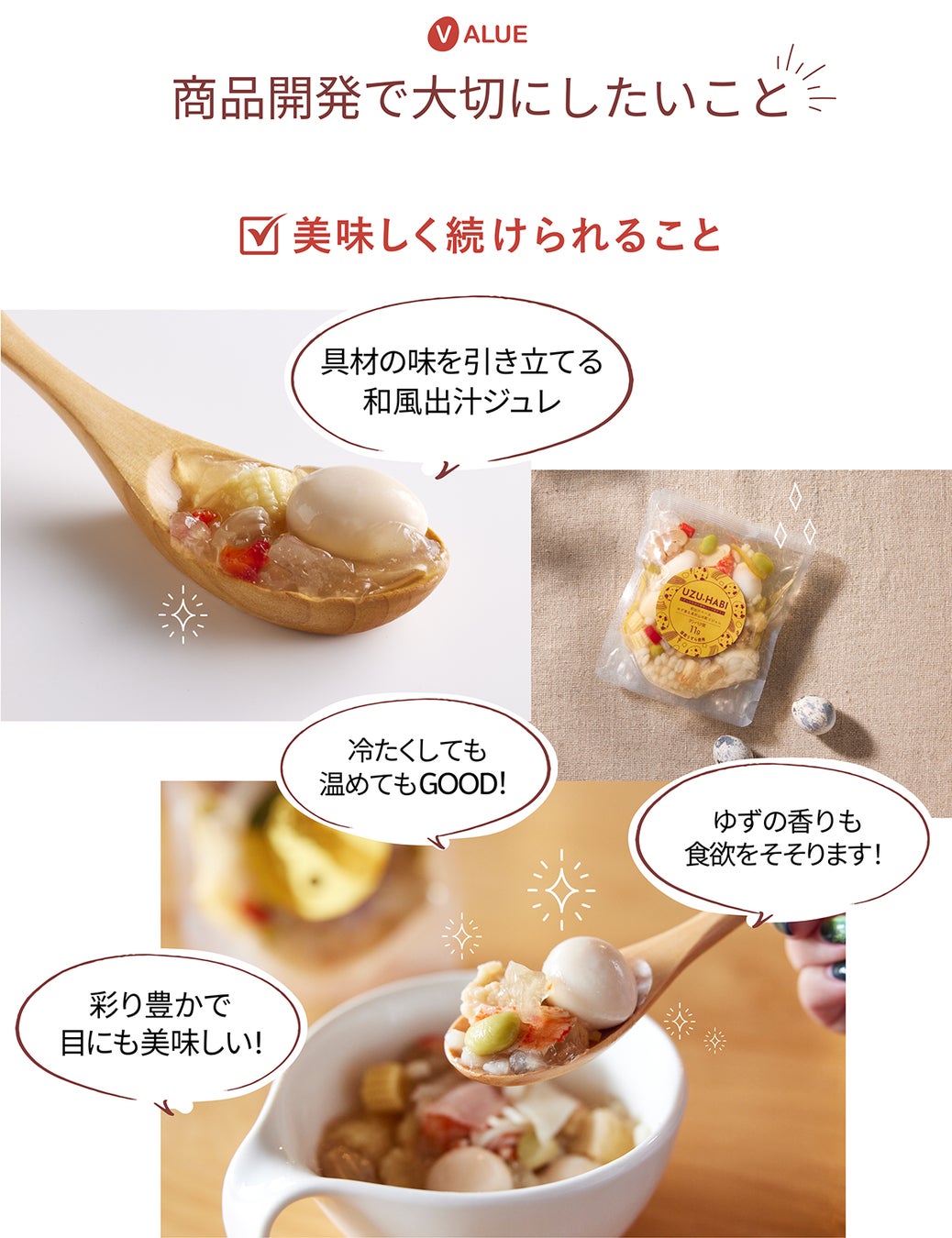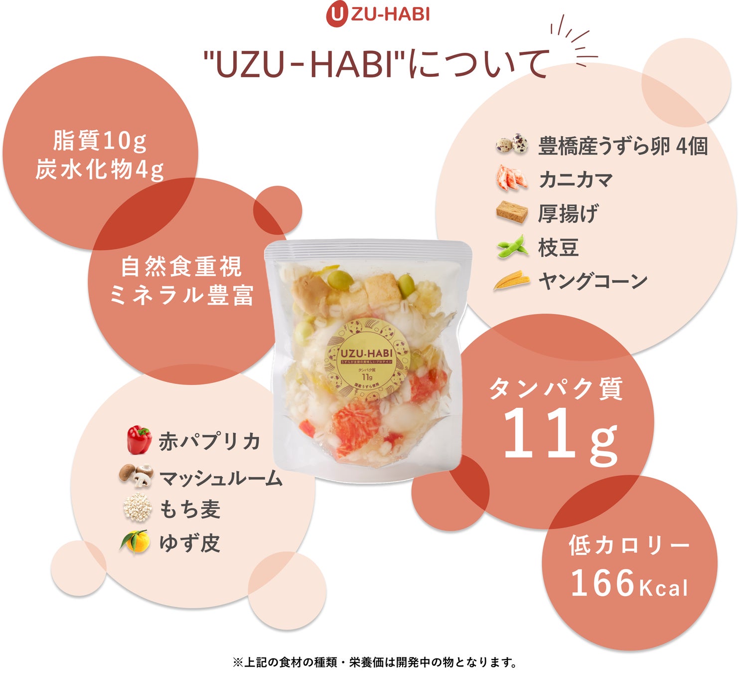 うずら卵単体を多く食べてもらう事を目指すのではなく、食事として機能を果たす事を重要視しています。うずら卵が主役とし、バランス良く1パッケージで完結するものを目指しています。食材は豊橋うずら卵をはじめ、9種類を「和風出汁ジュレ」に閉じ込めタンパク質、鉄分、葉酸などミネラルも摂取可能にしています。