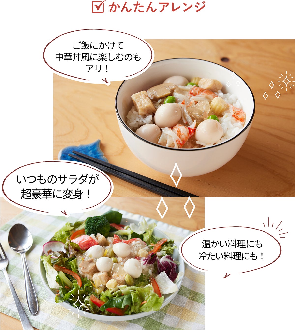 いつも簡単に済ませがちな、サラダをパワーアップさせたり、ご飯に乗せて中華丼風にしたり、冷やしたUZU-HABIを乗せて冷や汁っぽくもできアレンジの幅が広いのも特長です。
