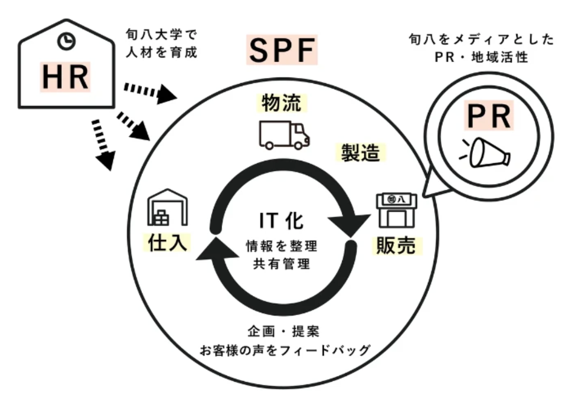 株式会社アグリゲートは、「未来に“おいしい”をつなぐインフラの創造」をミッションに、これからの社会構造の変化に対応しうる新しい機能を、今まで先人が築いた土台へと重ね、SPF(仕入・製造・物流・販売業)、HR(ヒューマンリソース)、PR(地域活性)の3つのサービス(※1)において新しい仕組みを作っています。