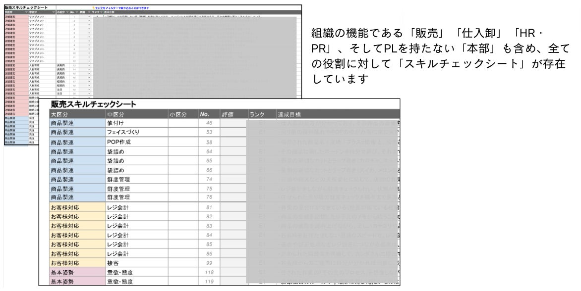2019年にサイズダウンを意思決定し、店舗数を半分以下に減らし、様々な事に手厚く取り組んで参りました。その中のひとつとして、「できること」や「できるまで」の仕組みの一部として自社独自のスキルチェックシートを機能させており、ひとりひとりのキャリアの後押しもしています。