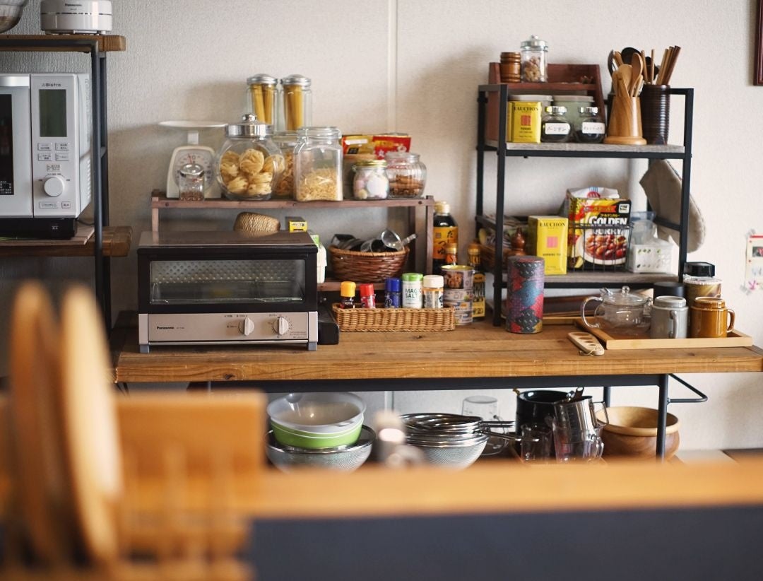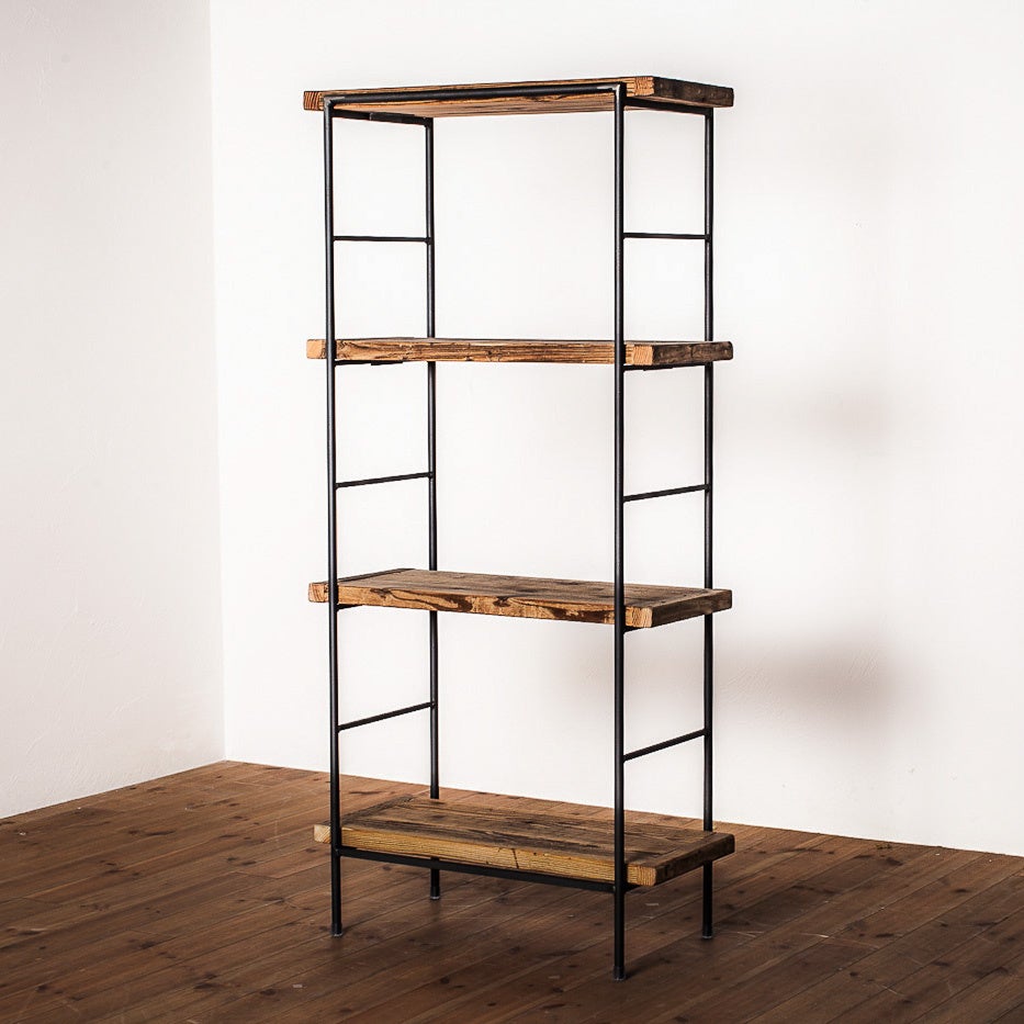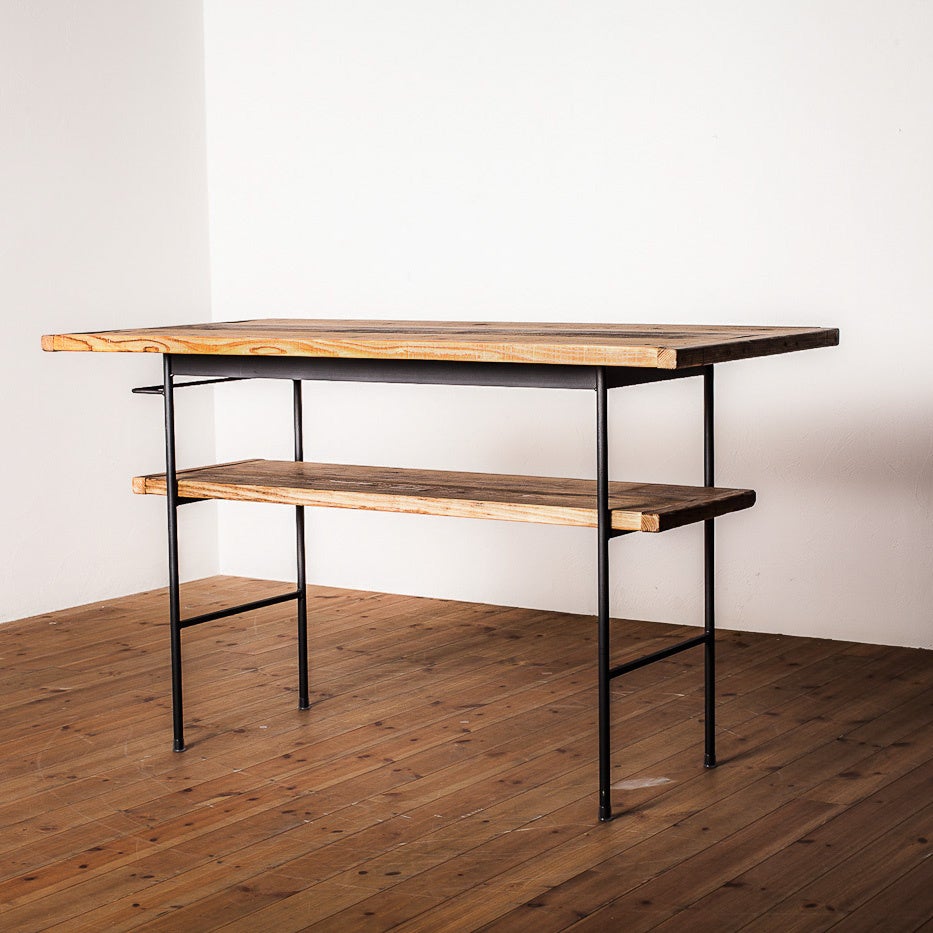作業台として使用しているのは、建築現場の足場板と鉄を組合せた、FACTシリーズのワークテーブル。床から天板までの高さが、少し高めの85cmとなっているので、立ったまま作業しやすいのが特徴です。電子レンジや調理器具を収納しているシェルフも、同じくFACTシリーズのワークシェルフ。棚板が可動式なので、棚間を自由に調節出来るのが魅力。沢山物を置いても細身の鉄フレームが軽やかな印象を与え、古材の質感が深みのある空間に引き立ててくれます。