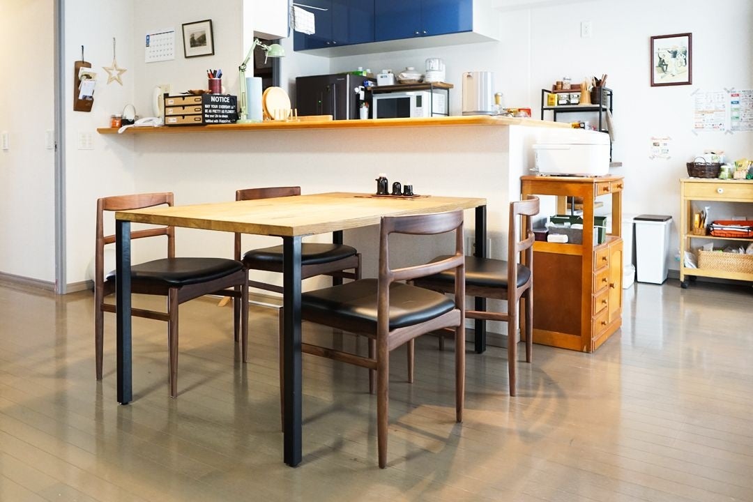 「おばあちゃん家の食事」と称される史朗の料理。それを並べる食卓には、「シンク ダイニングテーブル」。節有りの天然木ナラ材とスチール脚を組み合わせたダイニングテーブルです。テーブルに合わせてるチェアは、REMBASSY(レンバシー)の「ラウン サイドチェア」。