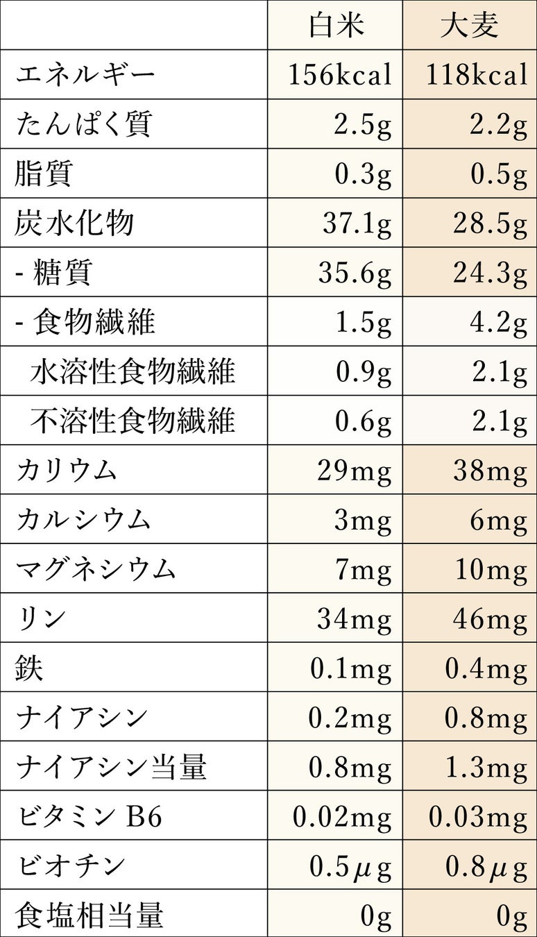 白米と比較すると、大麦には不溶性、水溶性の2種類の食物繊維がバランスよく豊富に含まれている※ことがわかります。食物繊維は人の消化酵素で消化できないことから、かつては身体に必要がないものと捉えられていましたが、昨今の研究では、腸を健やかな状態に保つなど、体内で有用な働きをすることで注目されています。中でも水溶性食物繊維「β-グルカン」は、ダイエットや生活習慣病対策にも役立つと言われています。
