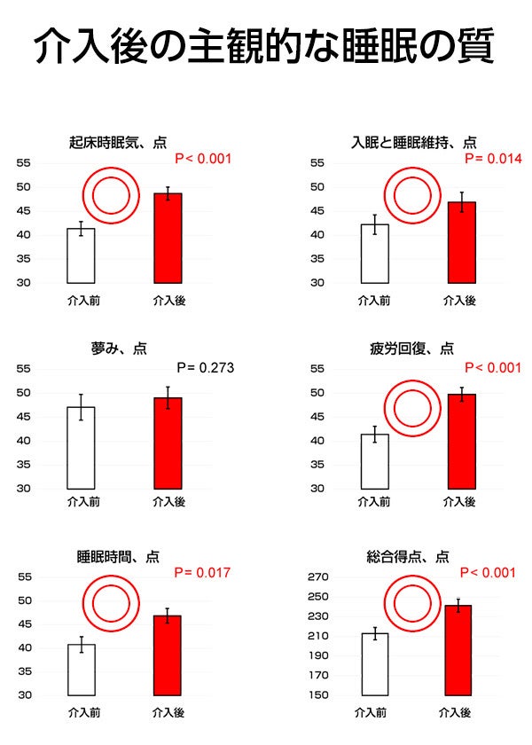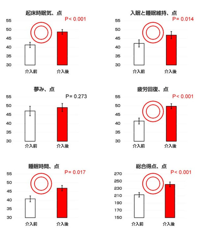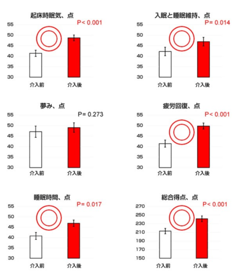 OSA睡眠調査票の回答結果では、6項目中5項目で統計学的に有意な改善結果が出ました。