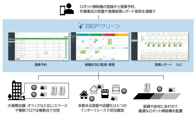 「BEPクリーン」は、メーカーや機種が異なる複数台のロボットをひとつのインターフェースで統合管理し、それぞれのロボットの清掃エリアや稼働スケジュールの設定・変更、定期的な清掃の実行、清掃結果のレポート出力などを遠隔で運用できる※2ソリューションです。