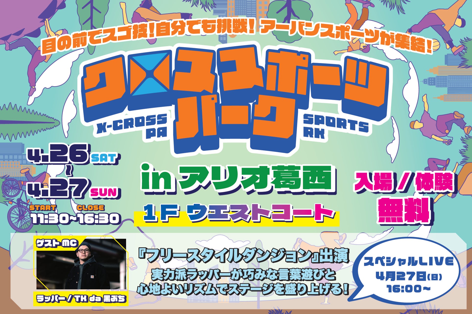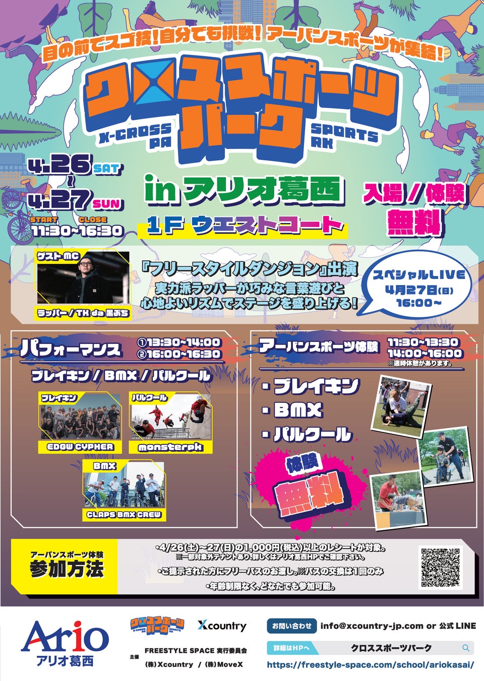 株式会社MoveX(本社:東京都品川区)が主催するアーバンスポーツイベント「クロススポーツパーク」が、2025年4月26日(土)・27日(日)の2日間、東京都江戸川区のアリオ葛西で開催されます。