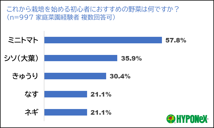4.家庭菜園初心者へのおすすめの野菜: 家庭菜園経験者が未経験者におすすめする野菜はミニトマトが57.8%、シソ(大葉)が36.0%とマンションベランダでも可能な野菜が上位となりました。