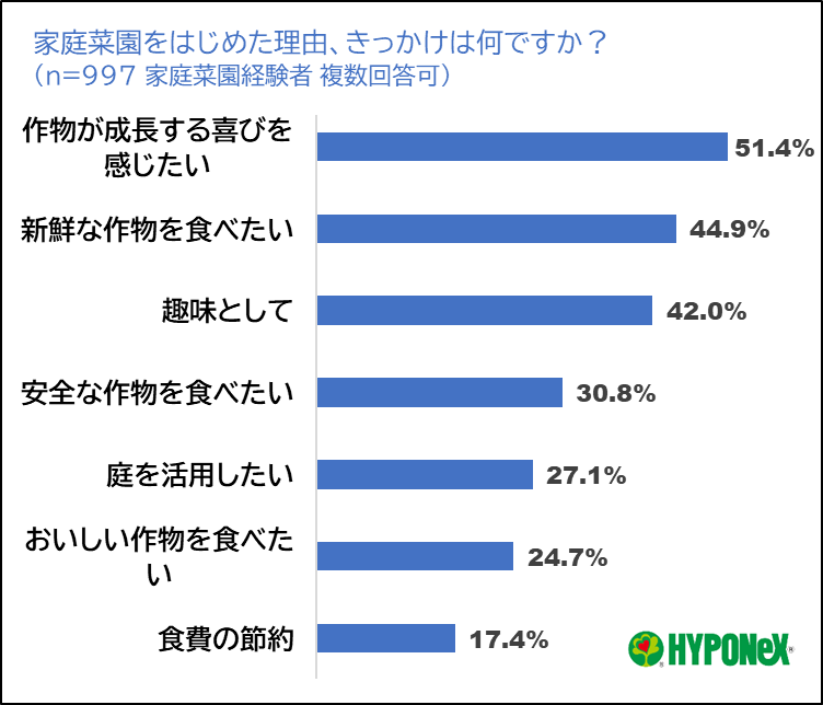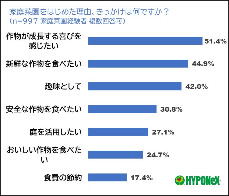 家庭菜園経験者が、家庭菜園を始めた理由を分析したところ「食費の節約のため(17.4%)」という声は意外にも少なく「作物が成長する喜びを感じたいため(51.4%)」「新鮮な作物を食べたいため(44.9%)」「趣味として(42.0%)」といった、生活への癒しや潤いを期待する意見が目立ちました。