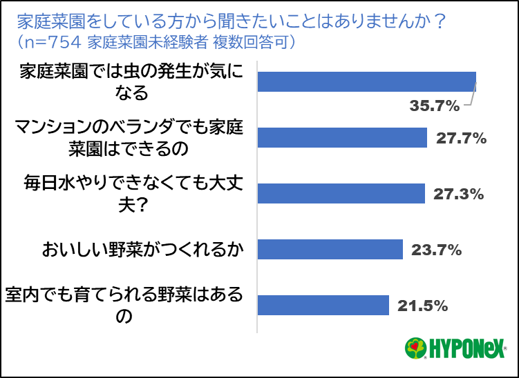 1.家庭菜園未経験者の最大の不安は「虫」: 家庭菜園未経験者が経験者に聞きたいことの第1位は「家庭菜園で虫の発生が気になる(35.7%)」第2位は「マンションのベランダでも家庭菜園はできるのか(27.7%)」と、栽培環境や手間に関する疑問が上位となりました。