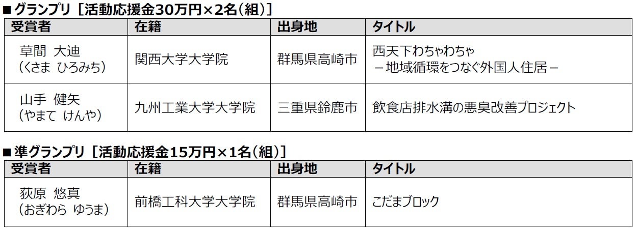 グランプリとなった草間さんの「西天下わちゃわちゃ-地域循環をつなぐ外国人住居-」は、地域が抱える複数の社会課題を相互に解決するアイデアへの期待感、山手さんの「飲食店排水溝の悪臭改善プロジェクト」は、その完成度の高さやビジネスモデル構築に向けた具体的な取り組みなどがそれぞれ評価され、この度の受賞に至りました。
